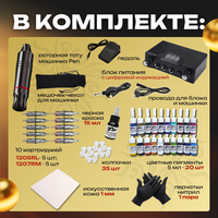 машинка пэн, чехол для машинки, блок питания, педаль с проводом, провода для блока и машинки, картриджи 5 RL 7 RM, цветная и черная краска, колпачки, перчатки, искусственная кожа