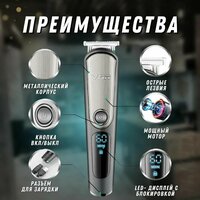 | Особенности | быстрая зарядка, дисплей, для чувствительной кожи, насадка для стрижки волос, нескользящая вставка на рукоятке, питание от USB, триммер |