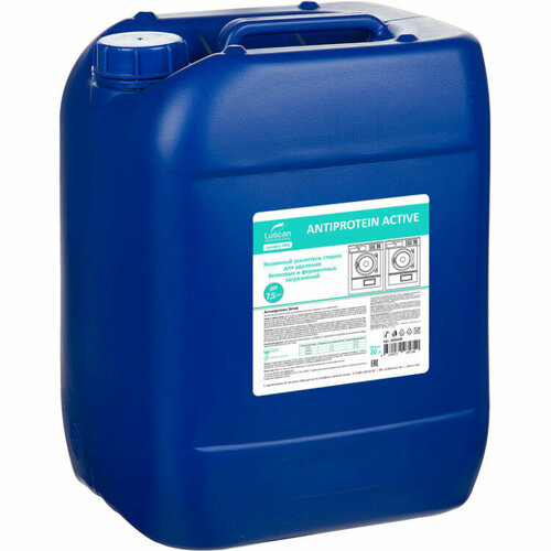 Жидкое средство для стирки энзимный усилитель Luscan Professional Antiprotein Active 20 л (концентрат). Область применения: для стирки и пятновыведения изделий из хлопка и смесовых тканей в профессиональных прачечных и химчистках, прачечных ЛПУ и перинатальных центров, детских учреждений, гостиниц, кемпингов, общежитий, прачечных общественного питания, пищевой и перерабатывающей промышленности, предприятий АПК, фармацевтических и биологических предприятий. Применяется в качестве энзимного усилителя стирки для удаления белковых, ферментных и жировых загрязнений. Свойства: высококонцентрированная формула эффективно удаляет белковые загрязнения и стойкие пятна. Препарат на основе смеси протеаз. Содержит комплекс ферментов для удаления широкого спектра загрязнений: жирового (растительные, животные и синтетические жиры, кожное сало) и белкового (кровь) происхождения. Может использоваться в качестве предварительной зачистки пятен белкового происхождения. Для выведения отдельных пятен препарат может наноситься непосредственно на пятно в виде концентрата. Предназначено для использования при низких температурных режимах стирки. Способ применения: для автоматической дозации. Дозировка определяется в зависимости от жесткости воды, характера загрязнения и типа ткани. Состав: подготовленная вода более 30%, оптимизированная смесь поверхностно-активных веществ 5-15% и протеаз менее 5%, стабилизатор протеазы менее 5%, комплекс энзимов менее 5%, комплексообразователи менее 5%, ингибиторы коррозии менее 5%, активные добавки менее 5%. Плотность: 1.04 г/куб. см. Значение pH 1%-раствора: 7.5 (+0,5). Условия хранения: хранить в плотно закрытой оригинальной упаковке производителя, при температуре от +5 С до +30 С в темном сухом недоступном для детей и животных месте, отдельно от пищевых продуктов. Не допускать длительного замораживания и попадания прямых солнечных лучей. Меры предосторожности: не смешивать с препаратами других торговых марок! Использовать защитные перчатки, очки и респиратор. Избегать попадания средства в глаза и на кожу. При попадании на слизистые промыть большим количеством воды. При необходимости обратиться к врачу. Не допускать попадания большого количества продукта в почву, сточные, грунтовые и поверхностные воды. Срок годности: 24 месяца с момента производства (при соблюдении условий хранения и транспортировки, рекомендованных производителем).