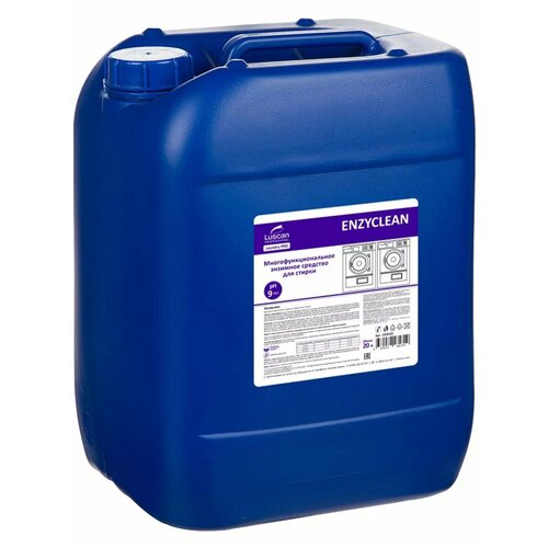 Жидкое энзимное средство для стирки Luscan Professional Enzyclean 20 л (концентрат)Область применения: для стирки изделий из хлопка и смесовых тканей в профессиональных прачечных и химчистках, прачечных ЛПУ и перинатальных центров, детских учреждений, гостиниц, кемпингов, общежитий, прачечных общественного питания, пищевой и перерабатывающей промышленности, предприятий АПК, фармацевтических и биологических предприятий. Применяется в качестве основного препарата для стирки цветных тканей.Свойства: высококонцентрированная формула отлично удаляет масляные загрязнения различного характера, оптимальная смесь ПАВ эмульгирует загрязнения и жиры в раствор, препятствуя обратному осаждению на поверхность ткани. Содержит в себе комплекс ферментов для удаления широкого спектра загрязнений: жирового (растительные, животные и синтетические жиры, кожное сало), белкового (кровь, молоко, яйцо), крахмального (соусов, кетчупа, горчицы), грима, тонального крема, шоколада, варенья и т.д.Может использоваться в качестве предварительной зачистки пятен белкового происхождения.После использования оставляет антиресорбирующую пленку на поверхности ткани, уменьшает повторное осаждение грязи на поверхность в процессе использования.Способ применения: для автоматической дозации. Дозировка определяется в зависимости от жесткости воды, характера загрязнения и типа ткани.Состав: подготовленная вода более 30%, оптимизированная смесь неионогенных поверхностно-активных веществ 15-30%, стабилизатор протеазы менее 5%, комплекс энзимов менее 5%, комплексообразователи менее 5%, активные добавки менее 5%.