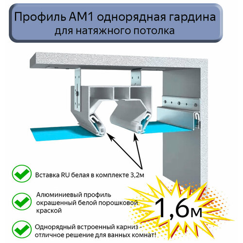 АМ1 – алюминиевый профиль, используется для изготовления ниш под карниз, отличнее решение для ванных комнат. Имеется 1 ряд для крепления штор, в комплекте вставка RU белая для гарпунного паза, для закрытия технического зазора. Для гардины 1,6 метра, вставка идет 3,2 метра, так как паз под гарпун имеется с обеих сторон гардины.