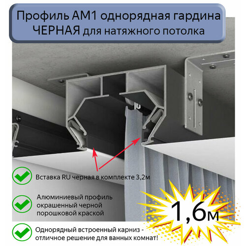 АМ1 – алюминиевый профиль, используется для изготовления ниш под карниз, отличнее решение для ванных комнат. Имеется 1 ряд для крепления штор, в комплекте вставка RU черная для гарпунного паза, для закрытия технического зазора. Для гардины 1,6 метра, вставка идет 3,2 метра, так как паз под гарпун имеется с обеих сторон гардины.