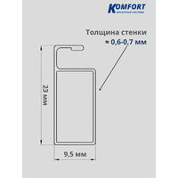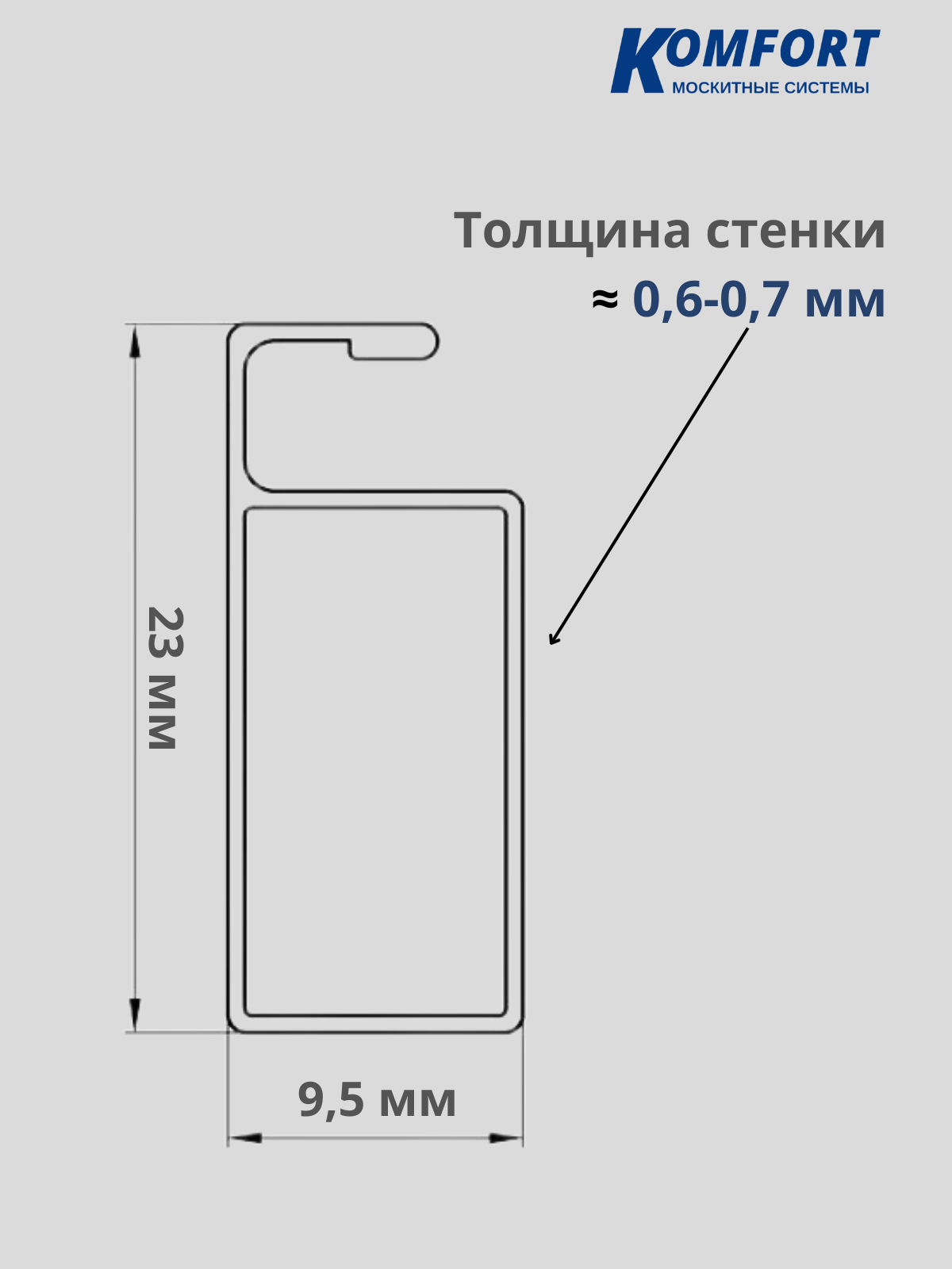 Возможна погрешность В длине профиля ± 3 мм. Рамный алюминиевый профиль для москитной сетки изготовлен из алюминия и покрыт порошковой краской. Надежно фиксирует москитное полотно и держит натяжение сетки. Использование профиля гарантирует долгий срок службы всей антимоскитной конструкции. Профиль универсален для оконных и дверных проемов. Размер регулируется обрезанием простой ножовкой по металлу. Профиль алюминиевый легкий и прочный, устойчив к прогибам, обладает идеальной геометрией и покраской. Производится в России. Толщина стенки 0,6-0,7 мм, масса за 1 пог. метр 0,95-100 граммов. Преимущества: - профиль совместим со всеми типами уголков; - долгий срок службы при правильной эксплуатации - не менее 10 лет; - профиль для москитной сетки устойчив к гниению и ржавчине; - качественное первичное сырье.