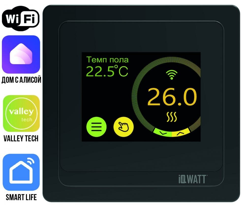 IQ THERMOSTAT SMART HEAT Wi-Fi предназначен для ручного, автоматического/программируемого поддержания установленной пользователем температуры в помещениях, оборудованных системами электрического обогрева «теплый пол» с использованием выносного или встроенного датчика температуры. Функция Wi-Fi позволяет контролировать, задавать, программировать и управлять всеми необходимыми параметрами через мобильное приложение VALLEY TECH. А также интегрировать системы «теплых полов»/ устройства управления в облачные сервисы для умного дома от TUYA - SMART LIFE.