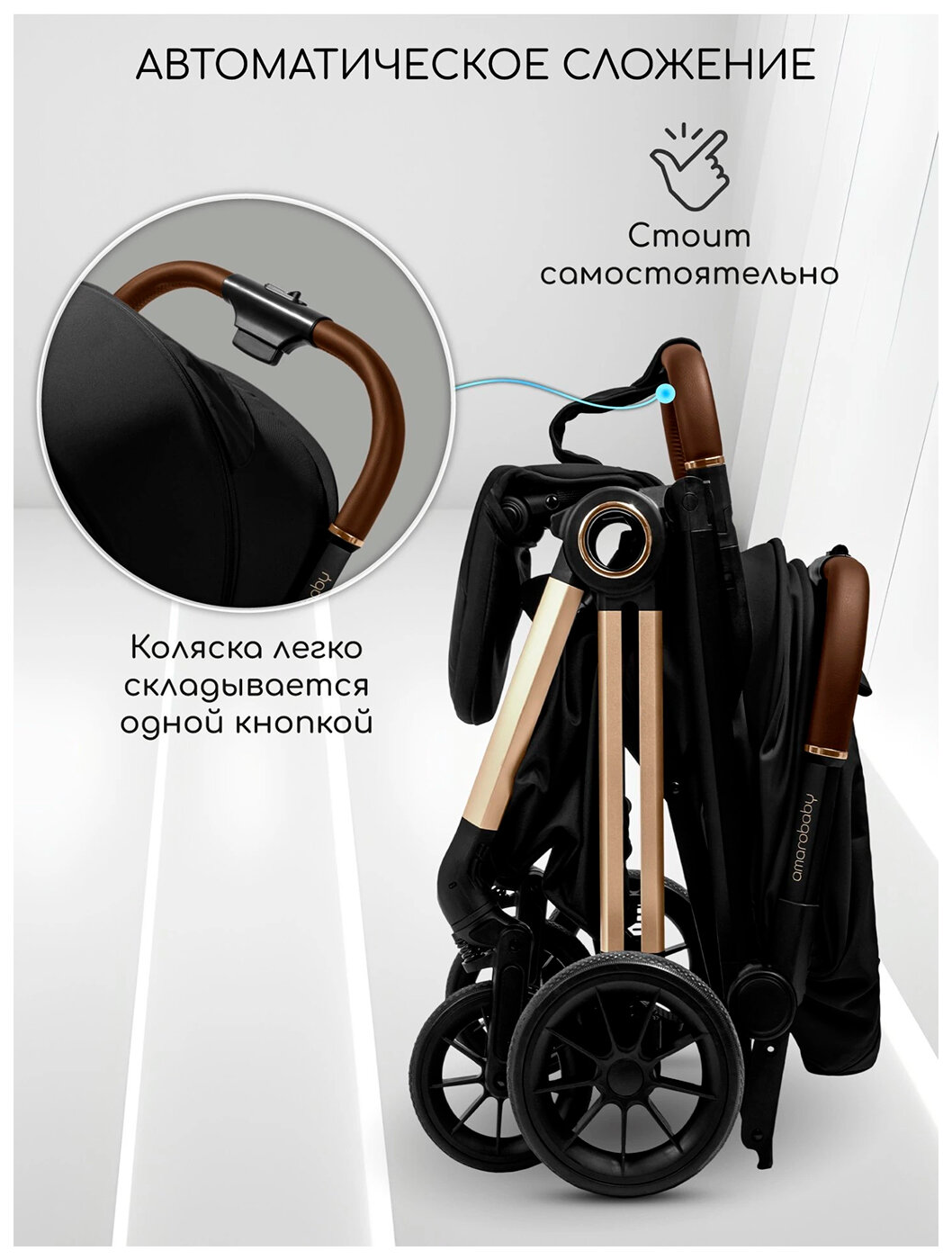 Главное преимущество коляски – это функция автоскладывания! Больше не нужно тратить время и силы на складывание коляски – просто нажмите кнопку, и она сложится сама. В сложенном виде коляска стоит самостоятельно, что очень удобно при хранении и транспортировке.