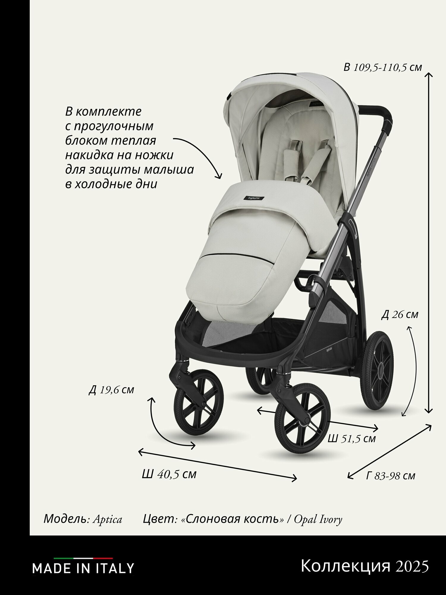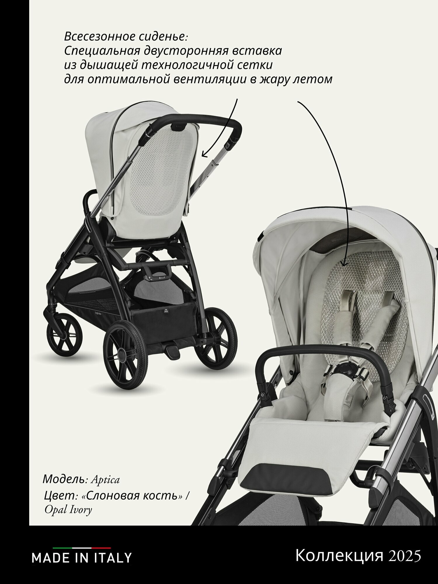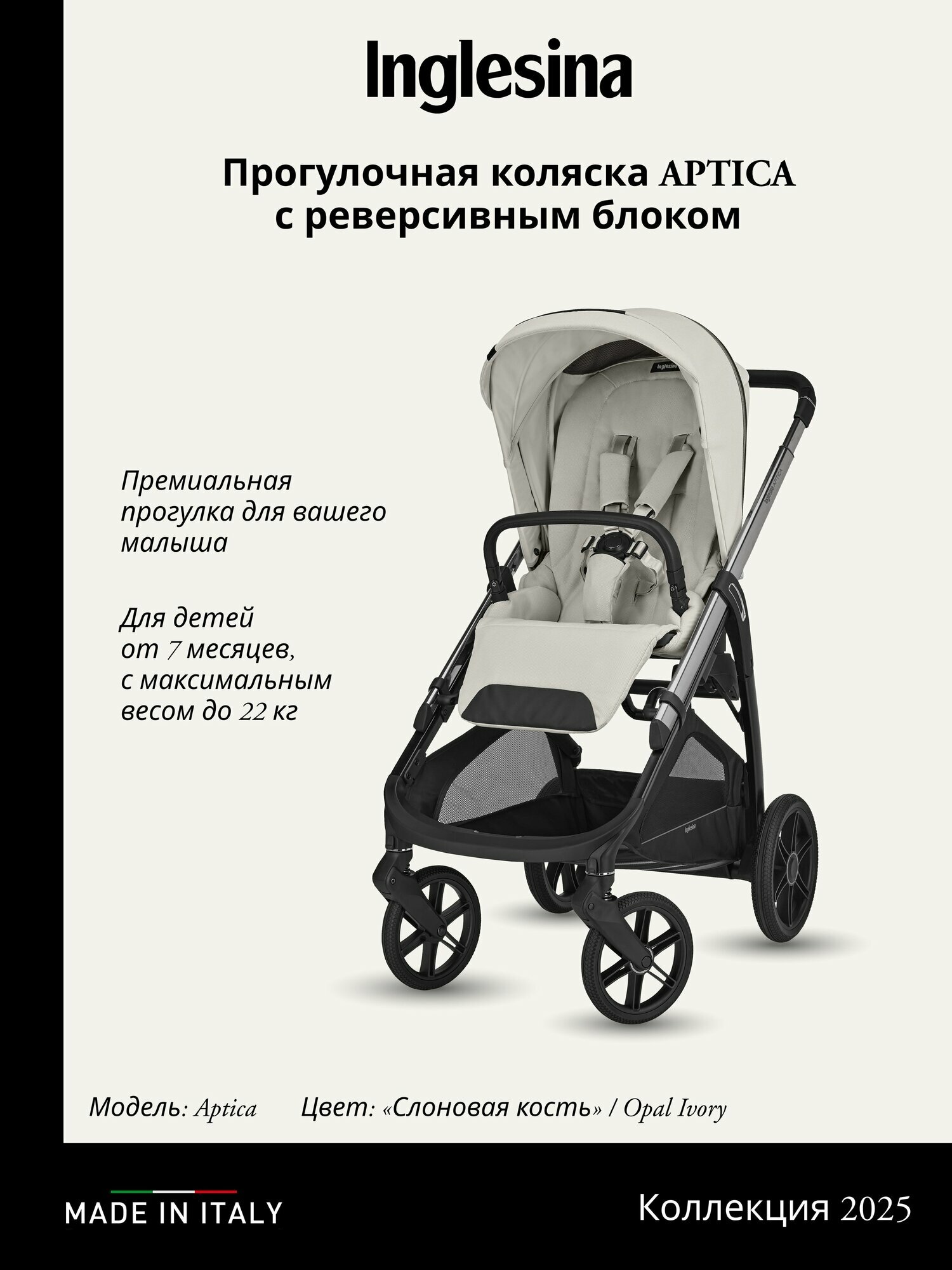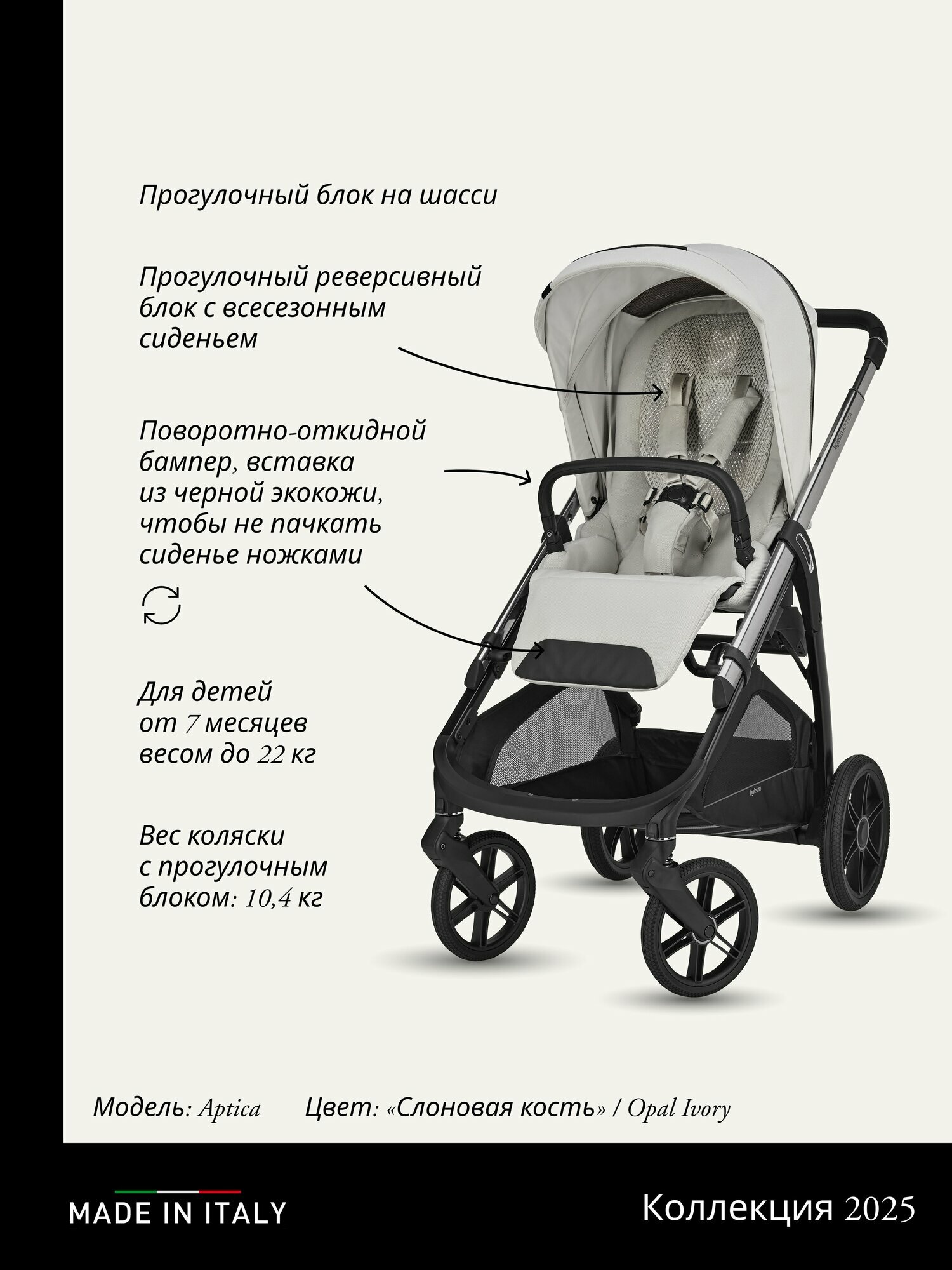 Aptica – прогулочная коляска с реверсивным прогулочным блоком и системой складывания «книжка». Предназначена для малышей с 7 месяцев и до достижения ими максимального веса 22 кг (до 4-х лет).