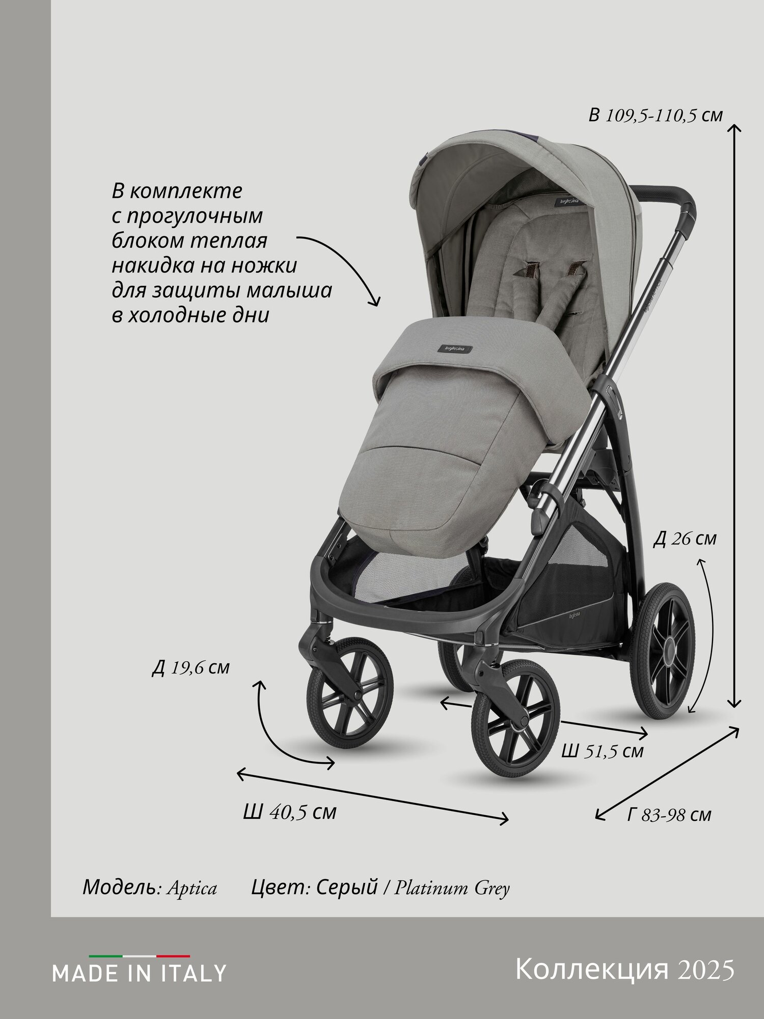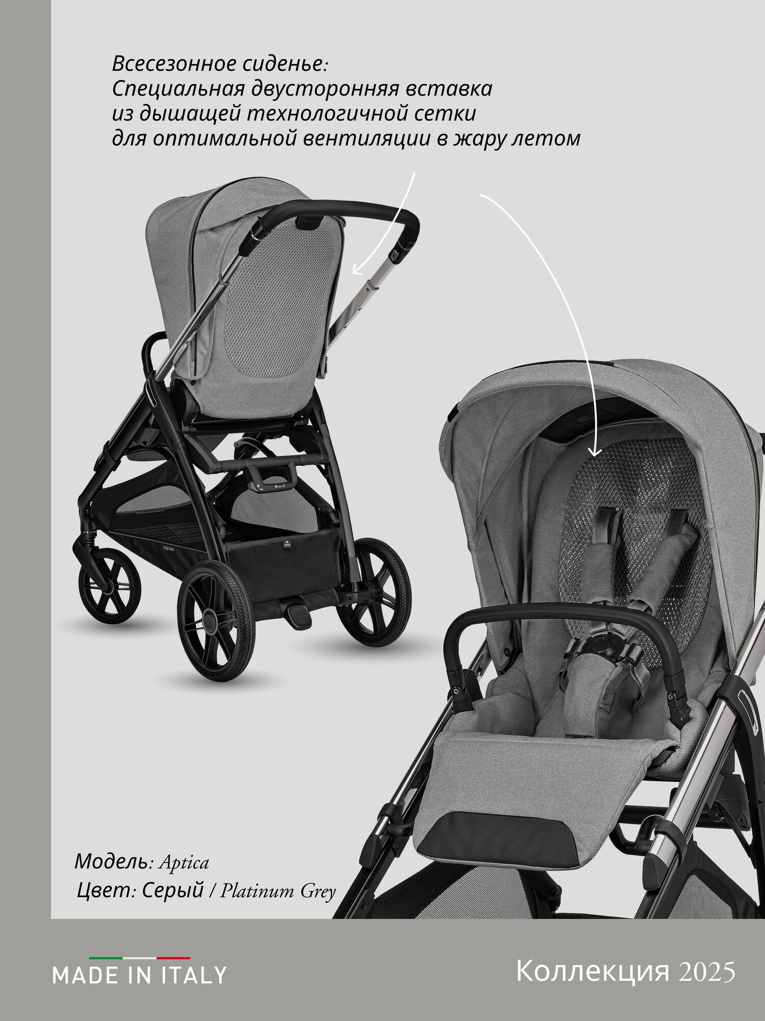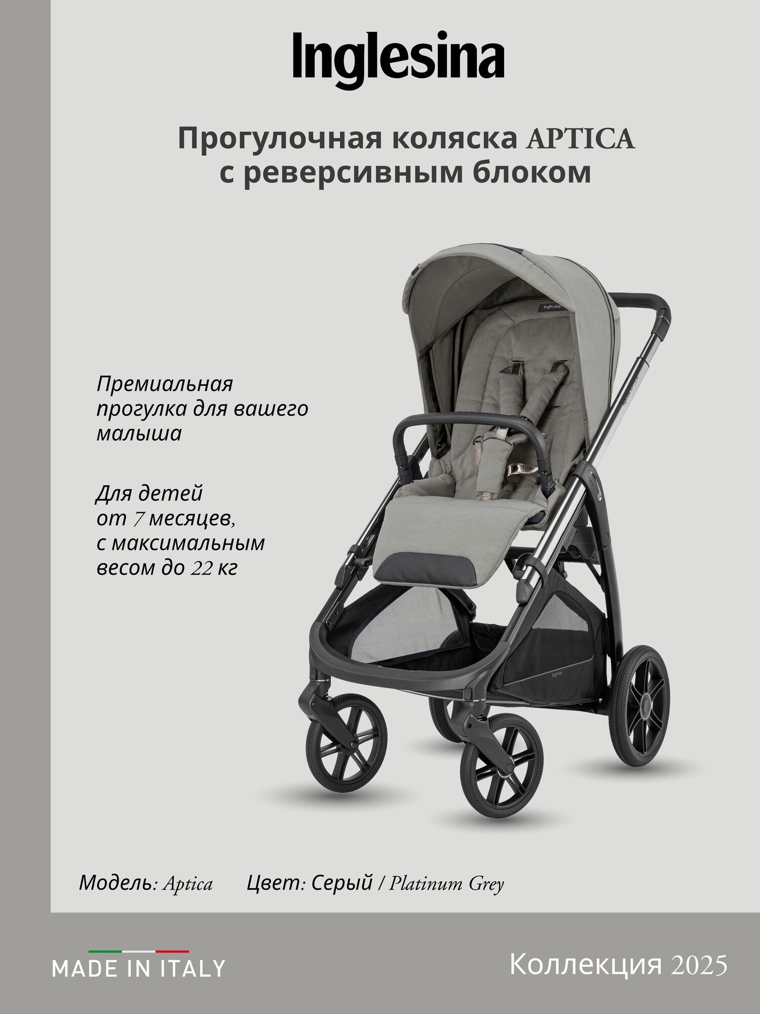Aptica – прогулочная коляска с реверсивным прогулочным блоком и системой складывания «книжка». Предназначена для малышей с 7 месяцев и до достижения ими максимального веса 22 кг (до 4-х лет).