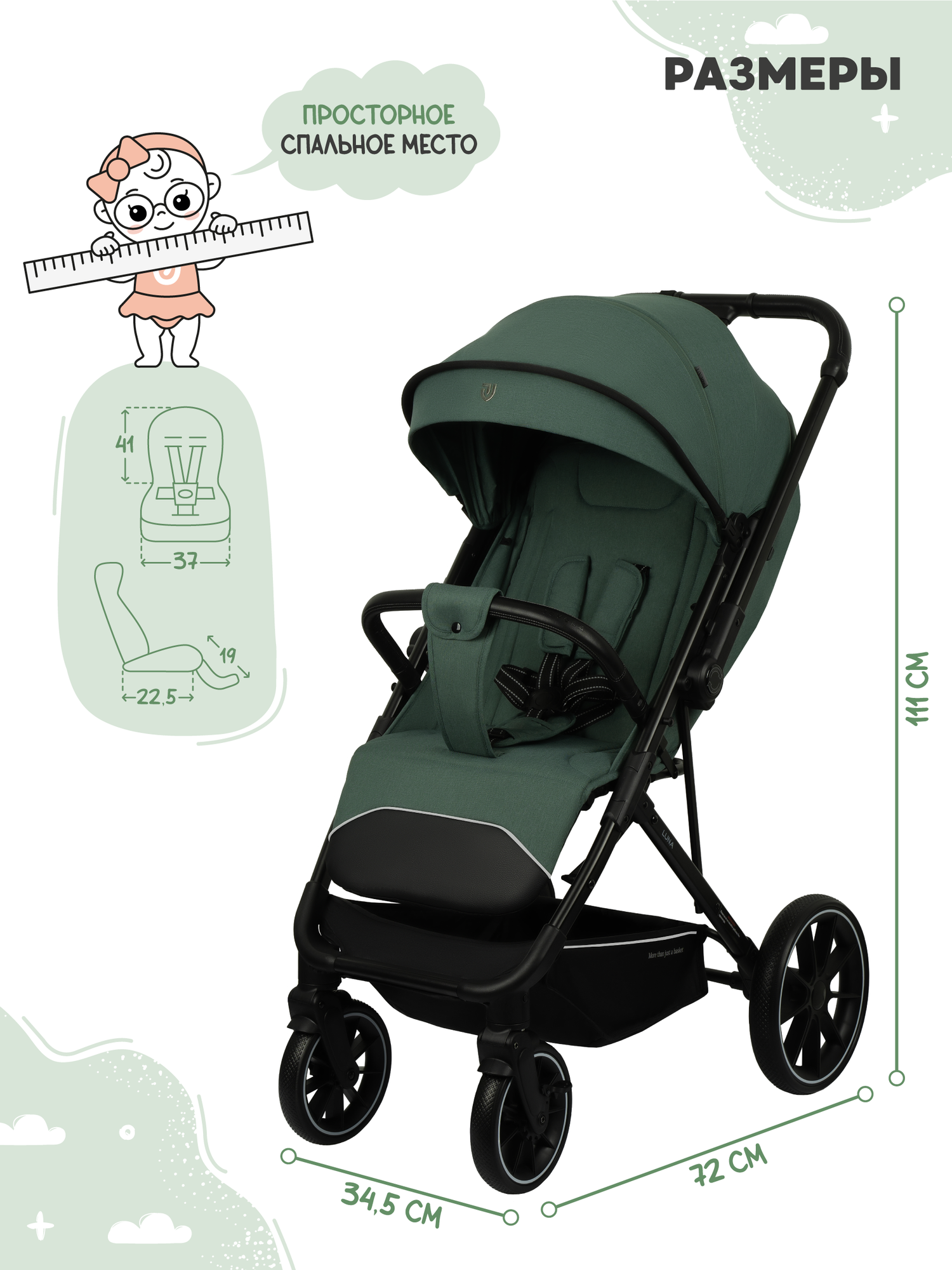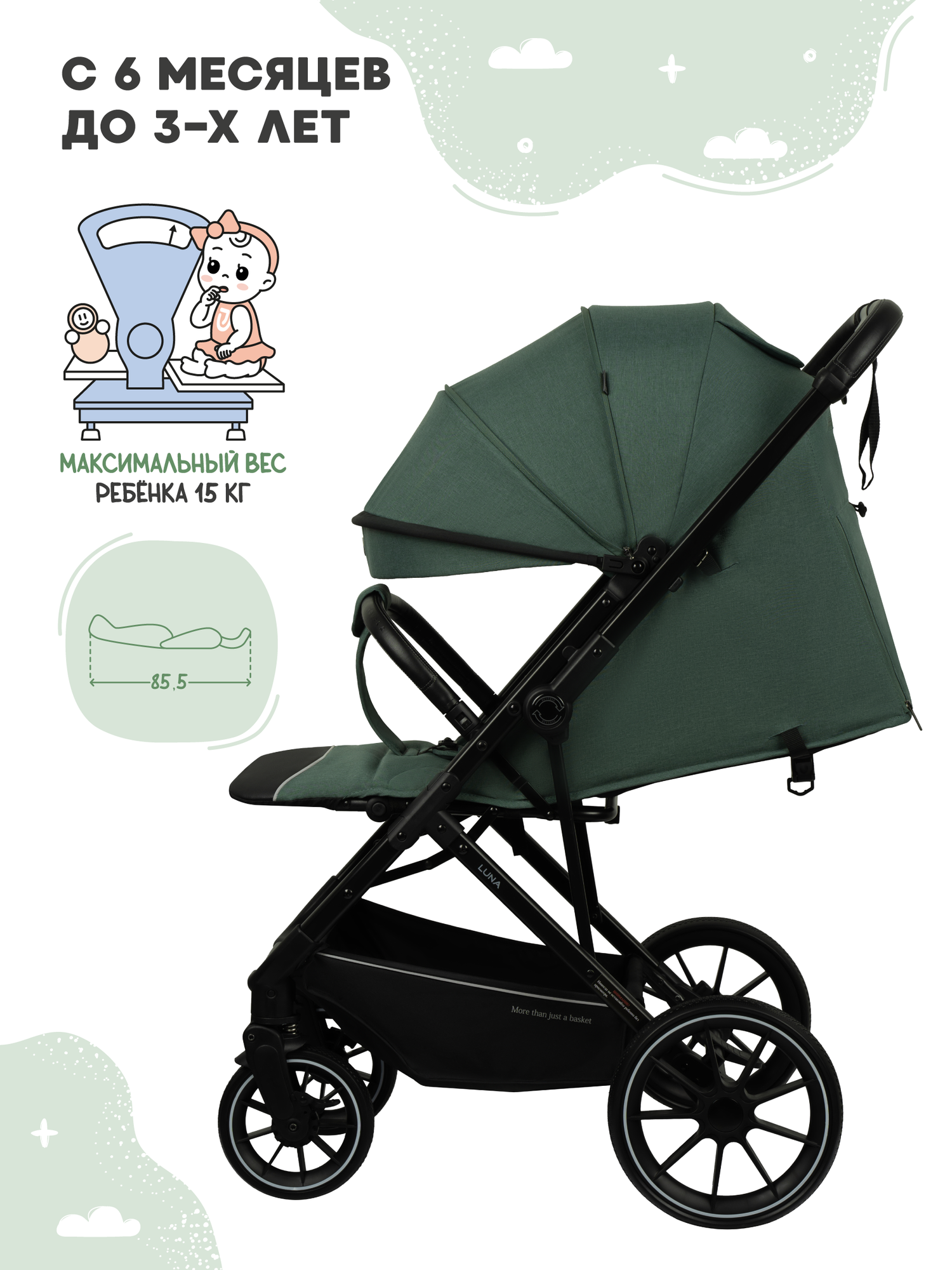 Для защиты от мошкары в комплекте идет москитная сетка. Для мелочей и игрушек предусмотрен кармашек на молнии. Для багажа и вещей малыша имеется открытая корзина. Коляски-прогулки LUNA легкие, удобные и практичные. Подходят для лета и зимы. Большой выбор цветовых решений для мальчика и девочки.