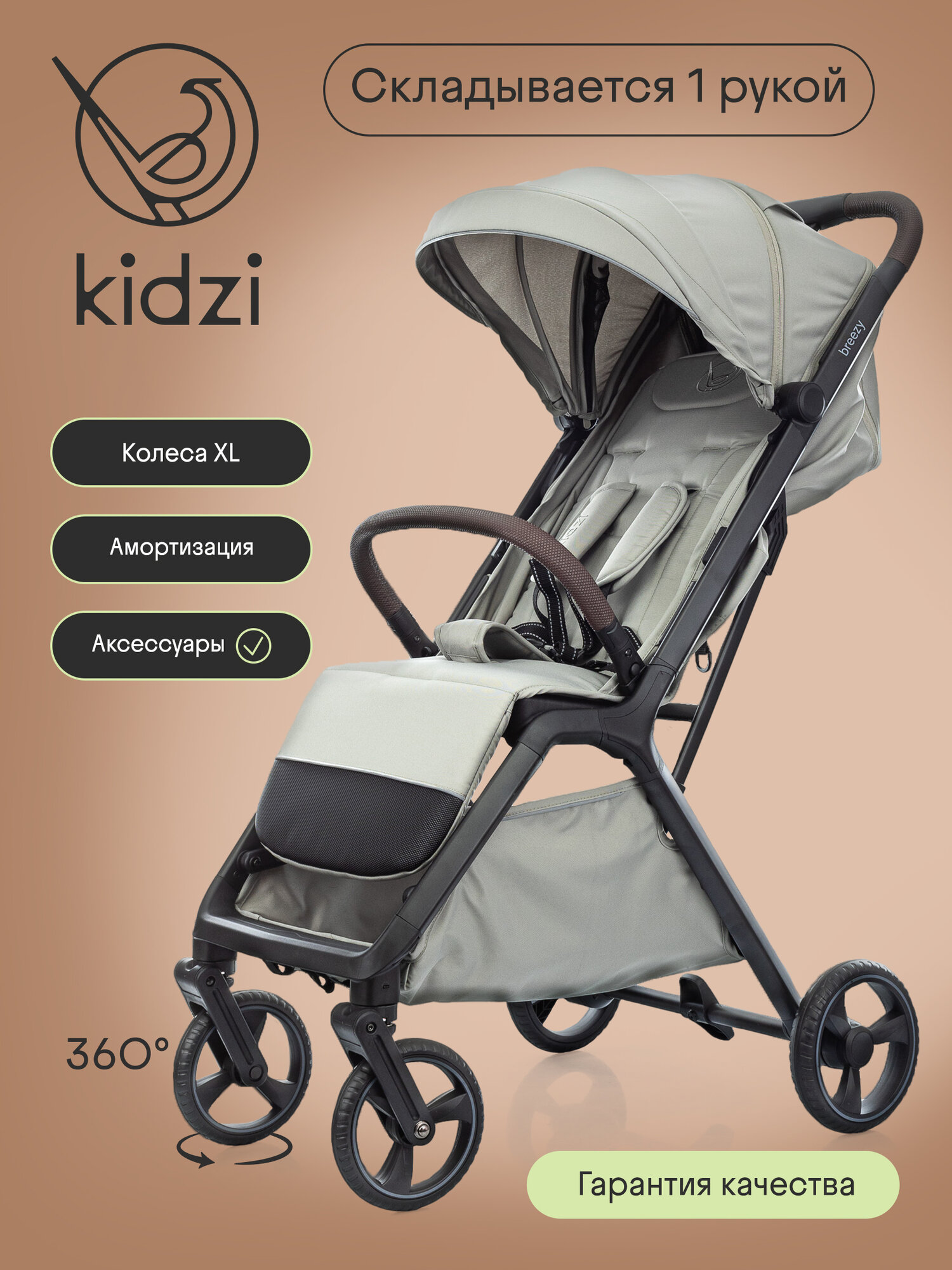 Купить Коляска прогулочная детская Kidzi Breezy, складная, c дождевиком и москитной сеткой, бежевый с доставкой по всей России.
