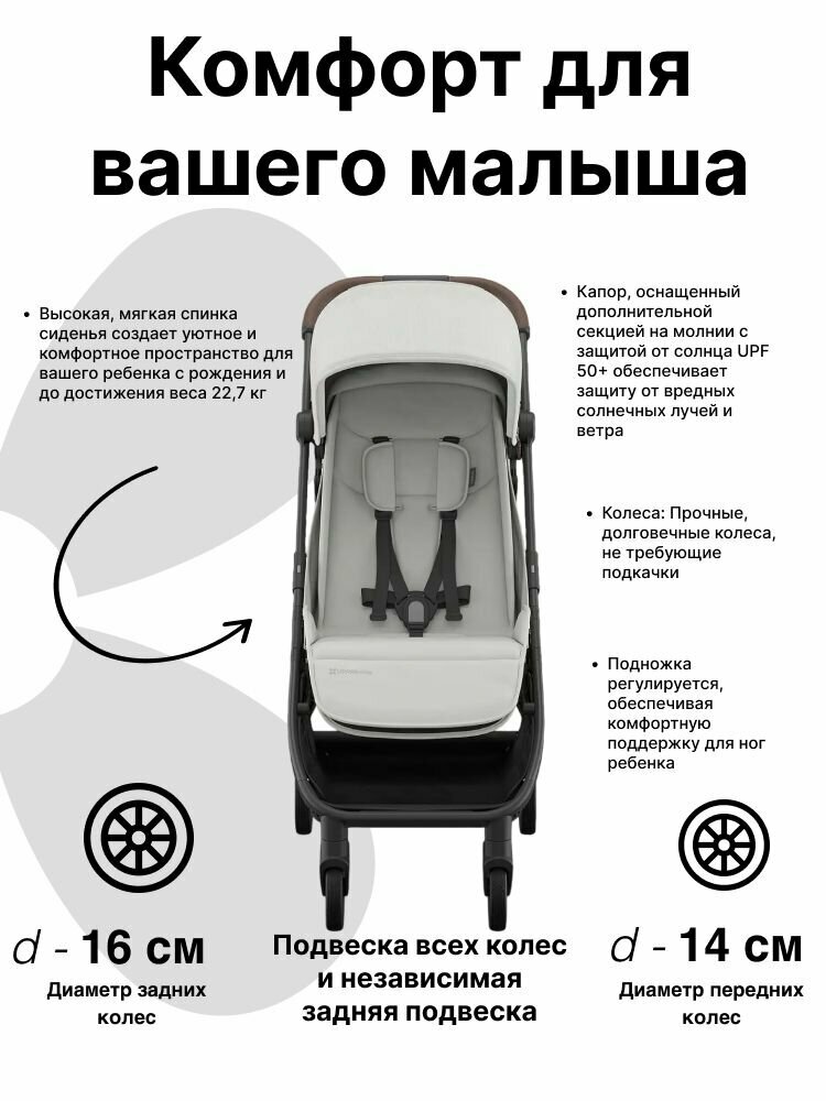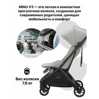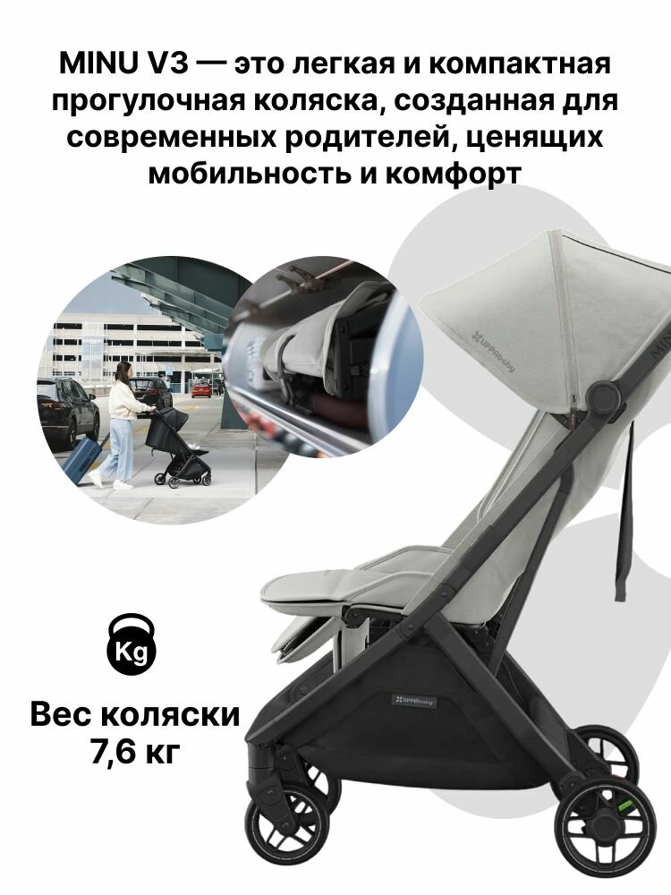UPPAbaby MINU V3: легкая и компактная прогулочная коляска, максимальной мобильности и комфорта! Она идеально подходит для путешествий, городских прогулок и повседневных задач. Благодаря компактным размерам MINU V3 легко помещается в любую багажную полку. Коляска очень компактная, маневренная, она буквально создана для быстрого темпа жизни и максимального комфорта! Складывается одним движением, занимает минимум места, в сложенном виде самостоятельно стоит, не пачкая ткань. Она идеальна для путешествий, городской жизни, транспорта и хранения дома. Просторное спальное место будет максимально комфортным для вашего малыша и подойдет ему с самого рождения и до 4 лет (22кг) Спинка раскладывается в горизонтальное положение. Она плавно регулируется, поддерживая вашего ребенка и обеспечивая ему максимальный комфорт. Пятиточечные ремни безопасности надежно защитят вашего малыша. Ремешки легко трансформируются в трехточечные, а легкая регулировка по высоте и мягкие накладки созданы для максимальной безопасности и комфорта ребенка. Подножка увеличивает спальное место и регулируется одной рукой, обеспечивая комфортную поддержку для ножек. Капор глубокий, надежно защищает от воды и солнца (UPF 50+), укрывает от ветра, а вентиляционное окошко обеспечивает комфортный воздухообмен. Подвеска всех колес и независимая задняя подвеска гарантируют плавный ход и комфорт на любой местности. Колеса цельные, не спускают. Вместительная корзина для покупок с легким доступом позволит взять с собой все необходимое, не перегружая ваши руки. Премиальный дизайн и материалы: Ручка из 100% натуральной кожи не только приятна на ощупь, но и придаёт коляске элегантный и современный вид.