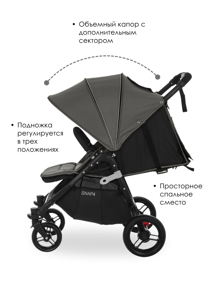 | Дополнительная информация | спинка регулируется бесшумно и плавно; при нажатии на педаль тормоза не пачкается верхняя часть обуви; спинка: ременная регулировка, наклон от 100° до 170°; подножка регулируется в 3-х положениях; возможность установки автокресла при помощи Адаптера Maxi Cosi / Snap & Snap 4 (приобретается отдельно); самостоятельно стоит в сложенном виде |