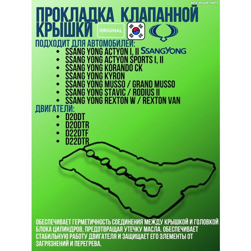 В данном списке перечислены все автомобили марки Ssang yong на которые данная прокладка клапанной крышки подходит, если в списке нет вашего автомобиля - она Вам не подходит.- Если вы сомневаетесь в совместимости данной прокладки с Вашим автомобилем задайте вопрос и укажите год / обьем двигателя / VIN номер для точного подбора.