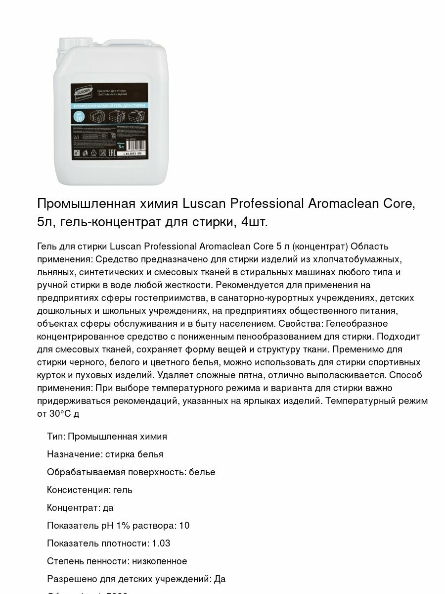Промышленная химия Luscan Professional Aromaclean Core, 5л, гель-концентрат для стирки, 4шт.: сравнение цен, характеристики, фото, актуальное наличие и цены.