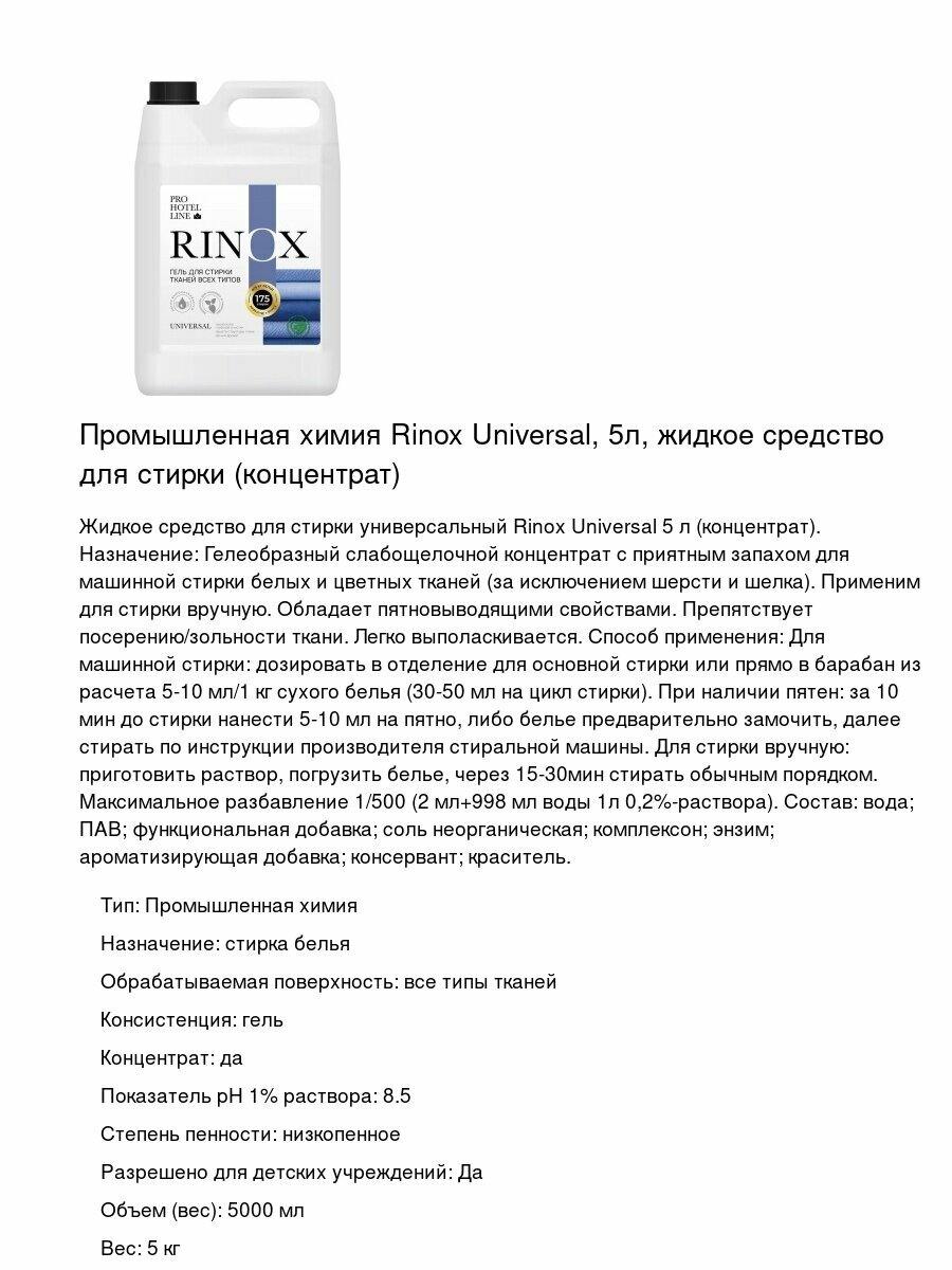 Купить Промышленная химия Rinox Universal, 5л, жидкое средство для стирки (концентрат) с доставкой по всей России. Промышленная химия Rinox Universal, 5л, жидкое средство для стирки (концентрат): сравнение цен, характеристики, фото, актуальное наличие и цены.