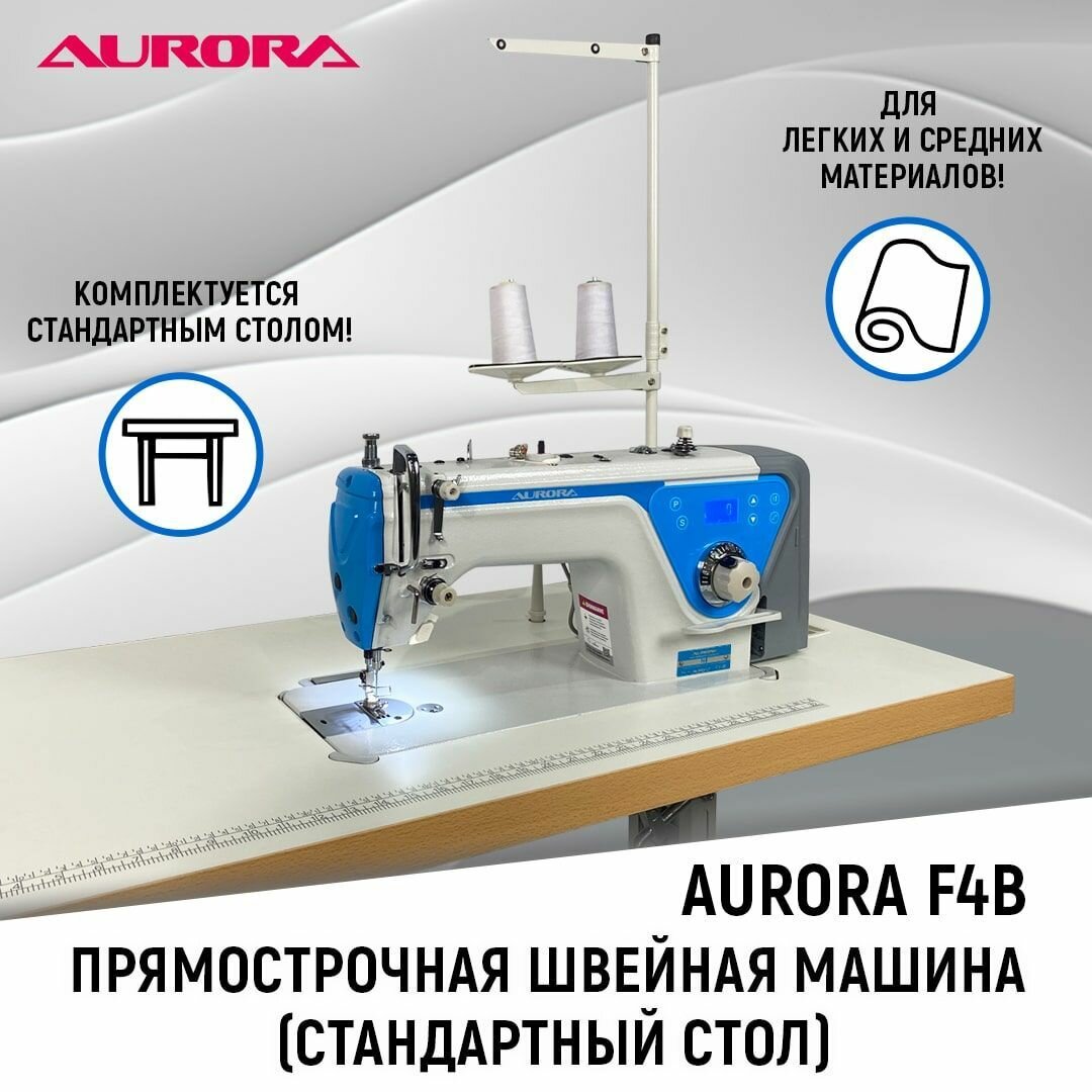 Aurora F4B - это одноигольная прямострочная швейная машина двухниточного челночного стежка с нижним продвижением, позиционером иглы, функцией плавный старт, функцией пошагового шитья и светодиодной подсветкой.