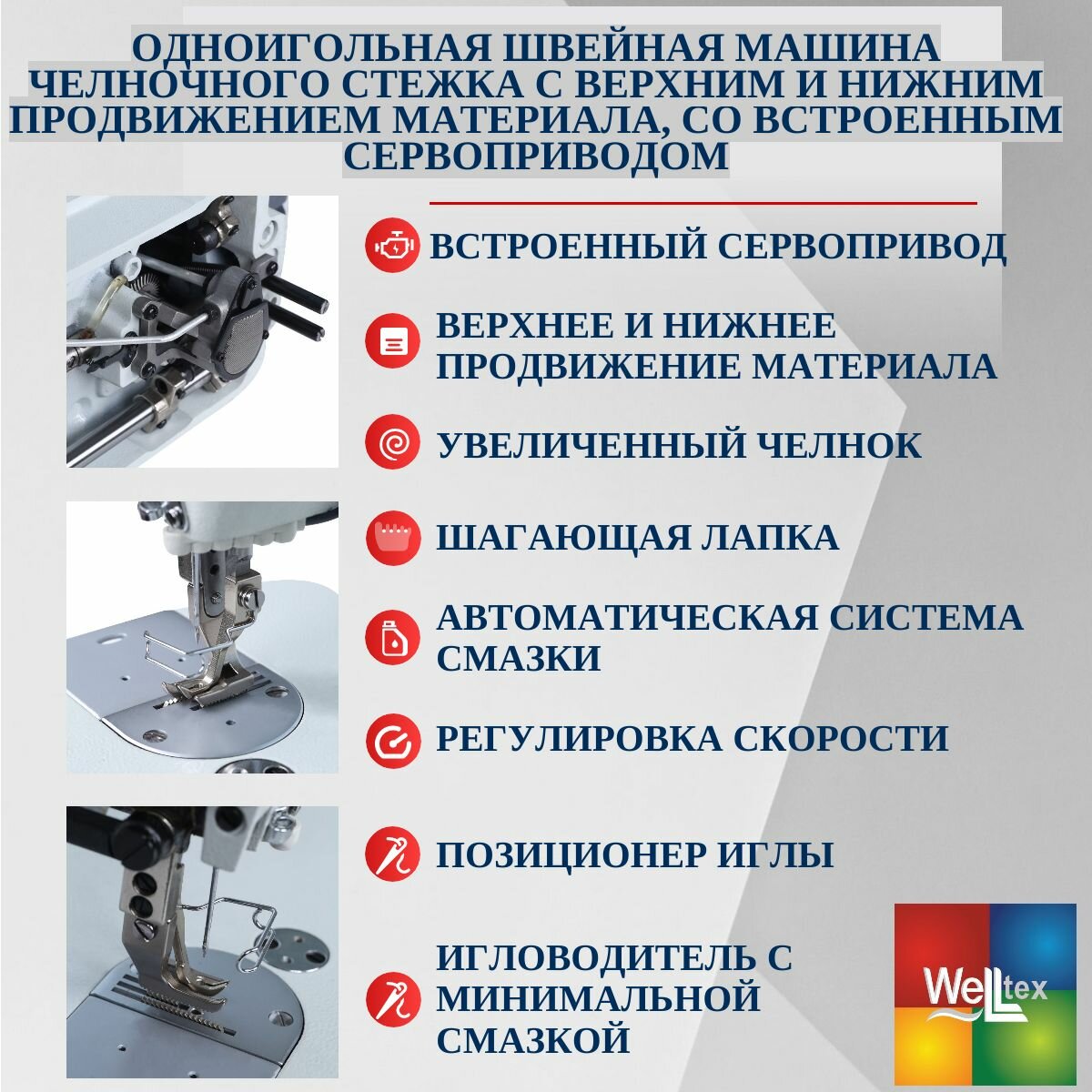 Одноигольная швейная машина челночного стежка с верхним и нижним продвижением материала, со встроенным сервоприводом