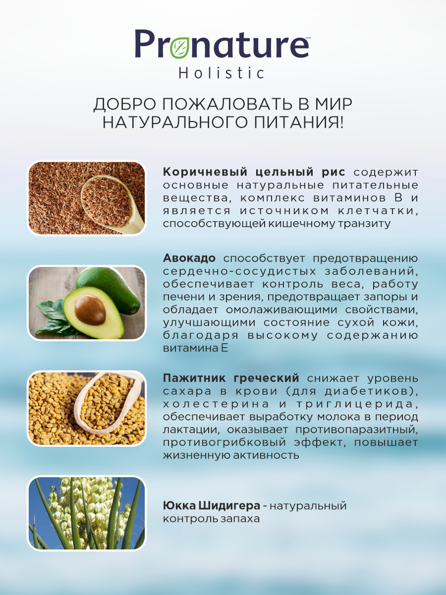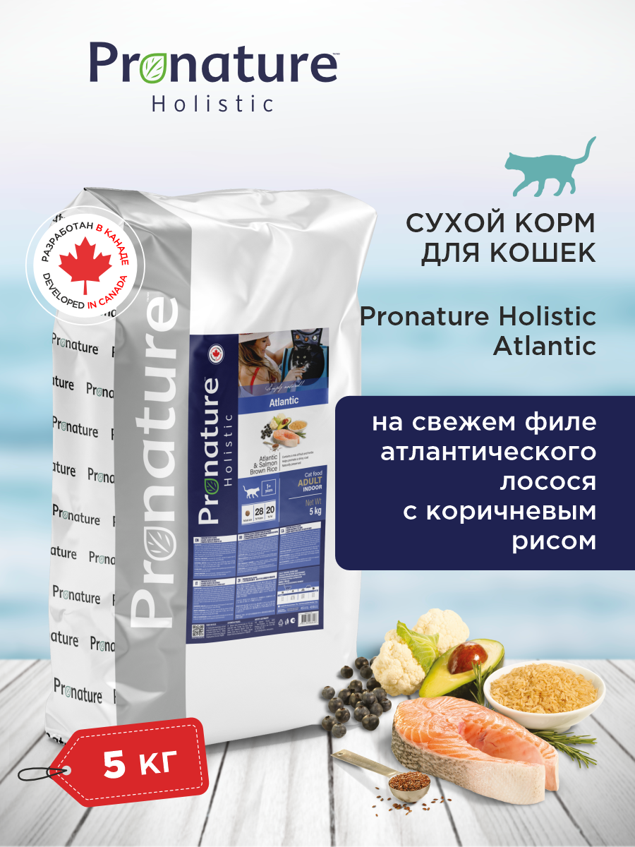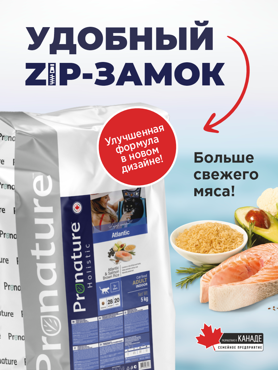 Добро пожаловать в мир натурального питания! Сухой корм для кошек, разработанный в Канаде, Pronature Holistic Atlantic (Пронатюр Холистик Атлантик) на свежем филе атлантического лосося – это оптимальное решение для заботливых владельцев, стремящихся дать своему пушистому другу лучшее сбалансированное питание. Свежий лосось, основной ингредиент этой монопротеиновой гипоаллергенной сбалансированной по питательным веществам и очень вкусной формулы, даёт оптимальное сочетание омега-3 и 6 жирных кислот, которые способствуют поддержанию здоровья кожи и блестящей шерсти. Коричневый цельный рис содержит основные натуральные питательные вещества, комплекс витаминов В и является источником клетчатки, способствующей кишечному транзиту. Авокадо способствует предотвращению сердечно-сосудистых заболеваний, обеспечивает контроль веса, работу печени и зрения, предотвращает запоры и обладает омолаживающими свойствами, улучшающими состояние сухой кожи, благодаря высокому содержанию витамина Е. Пажитник греческий снижает уровень сахара в крови (для диабетиков), холестерина и триглицерида, обеспечивает выработку молока в период лактации, оказывает противопаразитный, противогрибковый эффект, повышает жизненную активность. Юкка Шидигера - натуральный контроль запаха. Этот натуральный корм не содержит искусственных консервантов и ГМО, а также не содержит пшеницу, кукурузу, сою и мясокостную муку. Благодаря такому составу данный рацион способствует поддержанию здорового пищеварения и общего состояния здоровья кота. Кроме того, в рецептуре используются функциональные ингредиенты: целебные растения и натуральные источники хондропротекторов. Все это помогает укрепить кошачьи суставы и поддерживать их активность в течение долгого времени. Низкое содержание углеводов способствует оптимальному пищеварению и поддержанию нормального веса питомца. Сделайте выбор в пользу здоровья вашего кота, используя Pronature Holistic – лучший корм для счастья вашего любимца! Ваш питомец заслуживает только самое лучшее. ВСЕ грани мудрости мира В каждом кусочке!