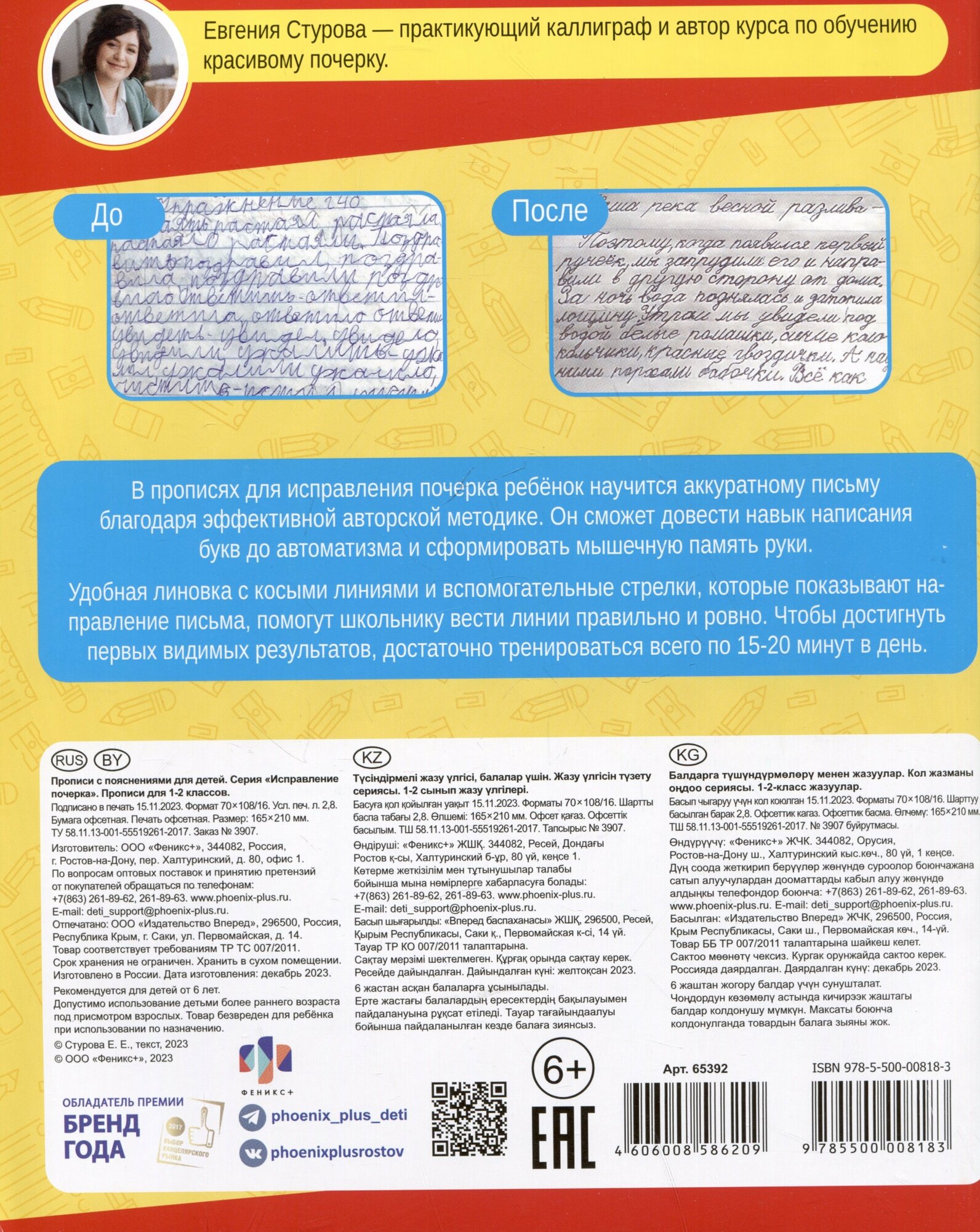 В прописях для исправления почерка ребенок научится аккуратному письму благодаря эффективной авторской методике. Он сможет довести навык написания букв до автоматизма и сформировать мышечную память руки. Удобная линовка с косыми линиями и вспомогательные стрелки, которые показывают направление письма, помогут школьнику вести линии правильно и ровно. Чтобы достигнуть первых видимых результатов, достаточно тренироваться всего по 15-20 минут в день. ¶ Издательство: Феникс; Максимальный возраст ребенка: До 9 лет; Автор: Не указан; ISBN: 4606008586209; Тип обложки: Мягкая обложка; Тип книги: Печатная книга; Количество страниц: 32;