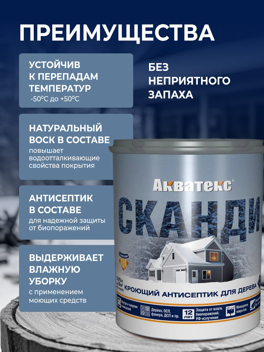 образует атмосферостойкое покрытие, надежно защищающее древесину от негативных факторов окружающей среды и устойчивое к перепадам температуру от -50? С до +50? С