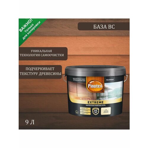 Пропитка декоративная для защиты древесины Pinotex Extreme база BC полуматовая 9 л - это высококачественное средство для обработки древесины, созданное для обеспечения долговечности и защиты от различных внешних воздействий.