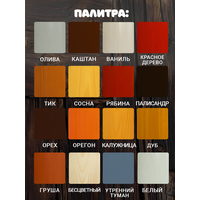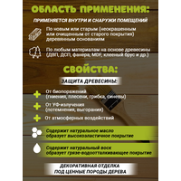 | Дополнительная информация | разбавление допускается, но не более 15% от общей массы состава; межслойная сушка -12 часов (при t +20±2°C); хранение и транспортировка: при t° от -40°С до +40°С, не теряет свойств при замораживании; состав: алкидные смолы, натуральное масло, уайт-спирит, натуральный микровоск, высокоэффективные трудновымываемые биоцидные компоненты, светостойкие транспарентные нано-пигменты, УФ-фильтры UVA и UVB-диапазонов, УФ-абсорберы; количество слоев: внутри помещения – 1-2 слоя, снаружи помещения – 2 слоя; расход в 1 слой: для строганой древесины: 1л на 10-15м², для пиленой древесины: 1л на 5-8м²; межслойная сушка -12 часов; допускается смешивание цветов между собой |