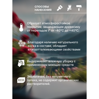 Особенность продукта — экологичный состав без запаха, возможность нанесения кистью, валиком, распылителем или окунанием, а также стойкость к суровым климатическим условиям от -40 до +40 °C. Обладает отличной укрывистостью, допускает разбавление водой до 10%, колеруется вручную и автоматически, не требует специальных условий для хранения и выдерживает до 5 циклов замораживания и оттаивания. Расход экономичен: 1 литр на 10–12 м² в один слой, полное высыхание — до 7 суток.