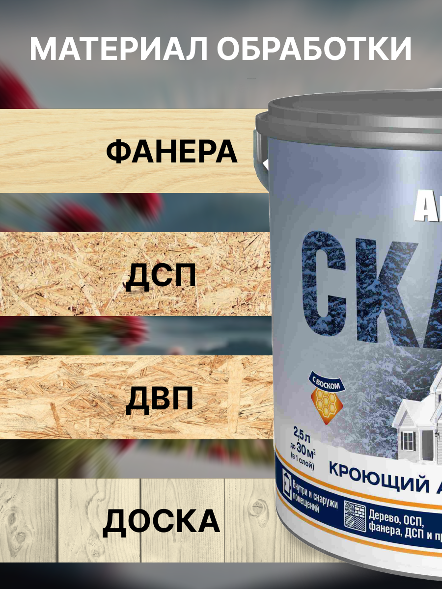 Кроющий антисептик для древесины Сканди — это современное защитно-декоративное средство, предназначенное для обработки деревянных поверхностей внутри и снаружи помещений, обеспечивая плотное матовое покрытие с видимой древесной структурой.