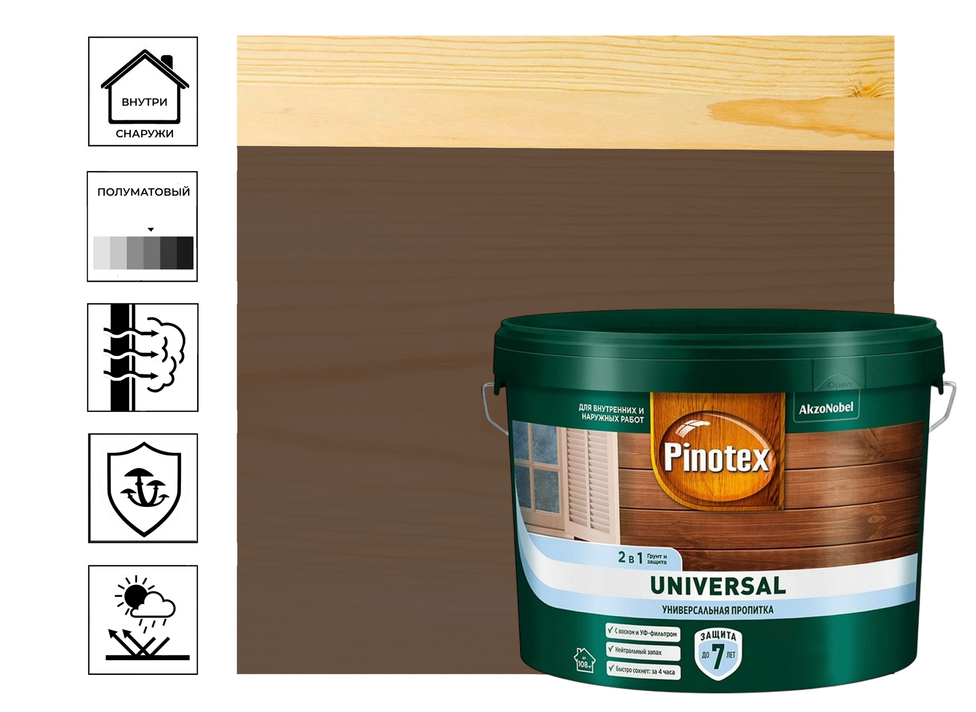 PINOTEX UNIVERSAL пропитка 2 в 1. Универсальная пропитка на водной основе для защиты древесины на срок до 7 лет* Для обработки древесины снаружи и внутри помещений. Формула 2 в 1. Наносится без грунта, защищает от влаги, загрязнений и атмосферного воздействия. Усилена УФ-фильтром для защиты от выгорания. С воском для лучшей влагостойкости. Паропроницаемое «дышащее» покрытие – не задерживает влагу внутри древесины. Быстро сохнет: за 4 часа Без запаха Расход до 12 м2/л Сохраняет видимой текстуру древесины. Полуматовая. Описание Универсальная пропитка на водной основе для защиты древесины на срок до 7 лет*. Для обработки древесины снаружи и внутри помещений. Формула 2 в 1. Наносится без грунта, питает и защищает от влаги, загрязнений и атмосферного воздействия. Усилена УФ-фильтром для защиты от выгорания. С воском для дополнительной влагостойкости. Паропроницаемое «дышащее» покрытие – не задерживает влагу внутри древесины. Запах нейтральный, легко наносится и быстро сохнет. Низкое содержание ЛОС (Летучие Органические Соединения) до 10г/л, легко наносится и быстро сохнет. Сохраняет видимой текстуру древесины, полуматовая. Для дополнительной защиты от плесени и грибка при наружных работах используйте антисептический грунт Pinotex Base. Область применения Для наружных работ: деревянные фасады, беседки из бруса, вагонки, планкена, а также окна, двери, скамейки и столешницы. Для внутренних работ: потолки, стены из бруса, бревен, вагонки, мебель. Допускается окрашивание деревянного пола с последующим нанесением яхтного лака Pinotex Lacker Yacht. Особенности применения Обрабатываемая поверхность должна быть сухой (влажность менее 18%), чистой. Работы рекомендуется проводить в безветренную погоду при температуре воздуха не ниже +10°C и не выше +30°C с относительной влажностью воздуха не более 80%. Внимание! При понижении температуры, увеличении относительной влажности воздуха время высыхания может увеличиваться. Перед нанесением и в процессе использования перемешивайте пропитку, не допуская образования пузырьков воздуха в банке. Наносите в 3 слоя кистью со смешанным ворсом по направлению волокон древесины или краскопультом. При использовании краскопульта сделайте пробное распыление на картоне, чтобы освоить технику работы. Наилучший результат достигается при включенном сопле на расстояние 30 см от деревянной поверхности. Между слоями выдержите от 4 часов. Тщательно пропитайте торцы древесины. Деформация древесины в процессе усадки или несоблюдение условий нанесения может привести к нарушению целостности покрытия, в этом случае проведите ремонтные работы по его восстановлению. При окраске большой поверхности во избежание разницы в оттенках используйте продукцию одной партии, либо смешайте продукт разных партий в одной емкости. Окончательный цвет на поверхности проявляется после высыхания и зависит от типа древесины, качества подготовки поверхности и количества нанесенных слоев. Для уверенности в выборе цвета рекомендуется сделать пробный выкрас. Эксплуатацию окрашенной поверхности начинайте не ранее чем через 14 дней после окрашивания. Разбавление Разбавление не требуется.