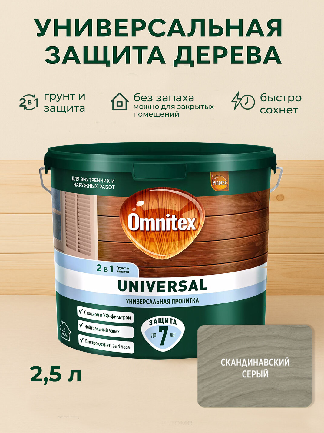 Пропитка для дерева Pinotex Universal используется как для наружных работ, так и безопасна для применения внутри помещений (универсальная), т. к. не содержит биоцидных добавок, не выделяет вредных веществ. Формула 2 в 1: наносится без грунта, питает и защищает от влаги и загрязнений, окрашенная поверхность устойчива к воздействию солнца, дождя, снега и мороза. Pinotex Universal легко наносится и быстро впитывается в поверхность древесины, образуя полуматовое покрытие. Подчеркивает естественную текстуру древесины.