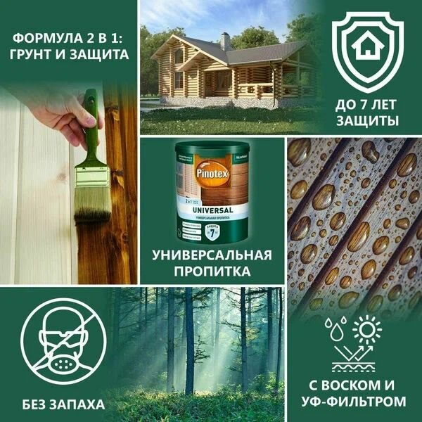 Формула 2 в 1: наносится без грунта, питает и защищает от влаги, загрязнений и атмосферного воздействия. Усилена УФ-фильтром для защиты от выгорания. С воском для дополнительной влагостойкости. Паропроницаемое «дышащее» покрытие – не задерживает влагу внутри древесины. Запах нейтральный, легко наносится и быстро сохнет. Низкое содержание ЛОС (Летучие Органические Соединения) до 10г/л. Сохраняет видимой текстуру древесины, полуматовая. Для дополнительной защиты от плесени и грибка при наружных работах используйте антисептический грунт Pinotex Base.