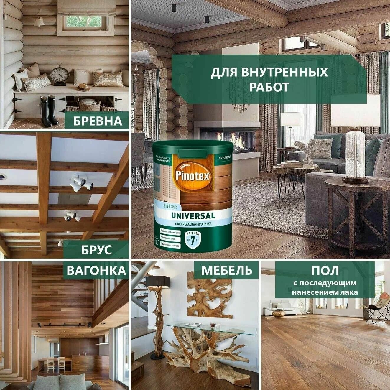 Для внутренних работ: потолки, стены из бруса, бревен, вагонки, мебель. Допускается окрашивание деревянного пола с последующим нанесением лака. Перед началом работ сделайте пробный выкрас и проверьте совместимость между материалами.