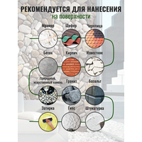 способ нанесения: Пропитка мокрый камень наносится на очищенную от пыли и грязи поверхность при помощи кисти, валика, краскопульта в один слой до полного насыщения поверхности. Перед применением состав рекомендуется перемешать.