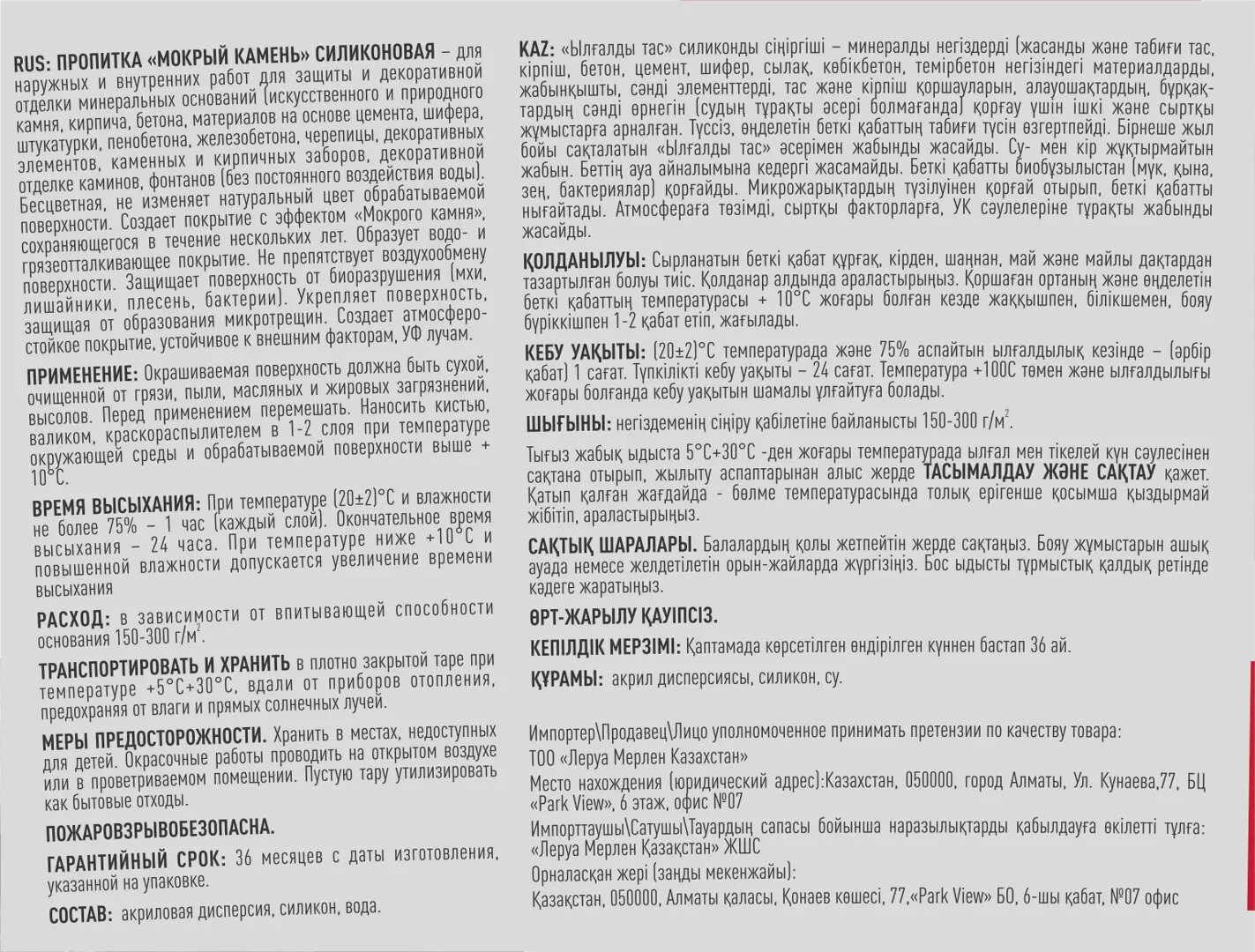 подходит для защиты и декоративной отделки минеральных основания (искусственного и природного камня, кирпича, бетона, материалов на основе цемента, шифера, штукатурки, пенобетона, железобетона, черепицы, декоративных элементов, каменных и кирпичных заборов, декоративной отделке каминов, фонтанов (без постоянного воздействия воды). Бесцветная, не изменяет натуральный цвет обрабатываемой поверхности. Создает покрытие с эффектом "мокрого камня", сохраняющегося в течение нескольких лет. Образует водо- и грязеотталкивающее покрытие. Не препятствует воздухообмену поверхности. Защищает поверхность от биоразрушения (мхи, лишайники, плесень, бактерии). Укрепляет поверхность, защищая от образования микротрещин. Создает атмосферостойкое покрытие, устойчивое к внешним факторам, УФ лучам.