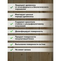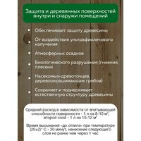 Свойства Защищает древесину от атмосферного и биологического поражения Имитирует ценные породы древесины Содержит красители стойкие к ультрафиолетовому излучению Придает поверхности полуматовый блеск Высыхание поверхности за 1час Не имеет запаха Способ применения Тщательно перемешать. Наносится кистью или валиком на чистую поверхность вдоль волокон древесины. Температура при проведении работ не должна опускаться ниже +5° C. Средний расход в зависимости от впитывающей способности поверхности - 1 л на 8-10 м², второй слой - 1 л на 10-12 м². Время высыхания «до отлипа» при температуре (20±2)° C - 30 минут, нанесение следующего слоя не ранее чем через 1 час. Внимание: окончательный цвет поверхность приобретает после высыхания.