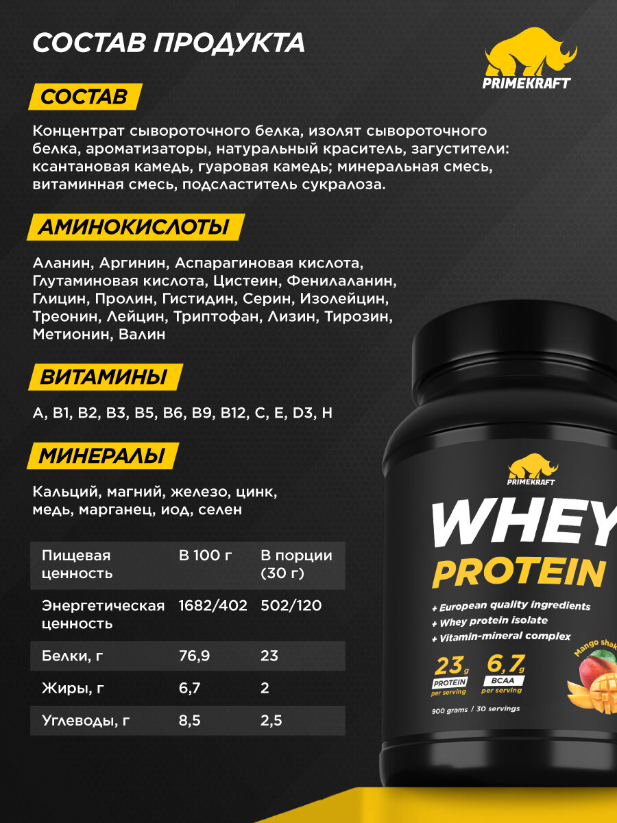 Протеин сывороточный PRIMEKRAFT Whey Protein, Манго Шейк (Mango Shake), банка 900 г / 30 порций: сравнение цен, характеристики, фото, актуальное наличие и цены.