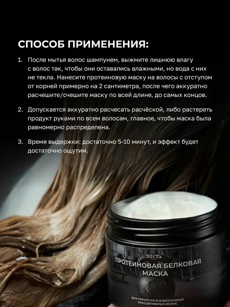 Если вы не будете правильно использовать косметику, то она не будет работать: 1. После мытья волос шампунем, выжмите лишнюю влагу с волос так, чтобы они оставались влажными, но вода с них не текла. Нанесите протеиновую маску на волосы с отступом от корней примерно на 2 сантиметра, после чего аккуратно расчешите/счешите маску по всей длине, до самых концов 2. Допускается аккуратно расчесать расчёской, либо растереть продукт руками по всем волосам, главное, чтобы маска была равномерно распределена 3. Время выдержки: достаточно 5-10 минут, и эффект будет достаточно ощутим.