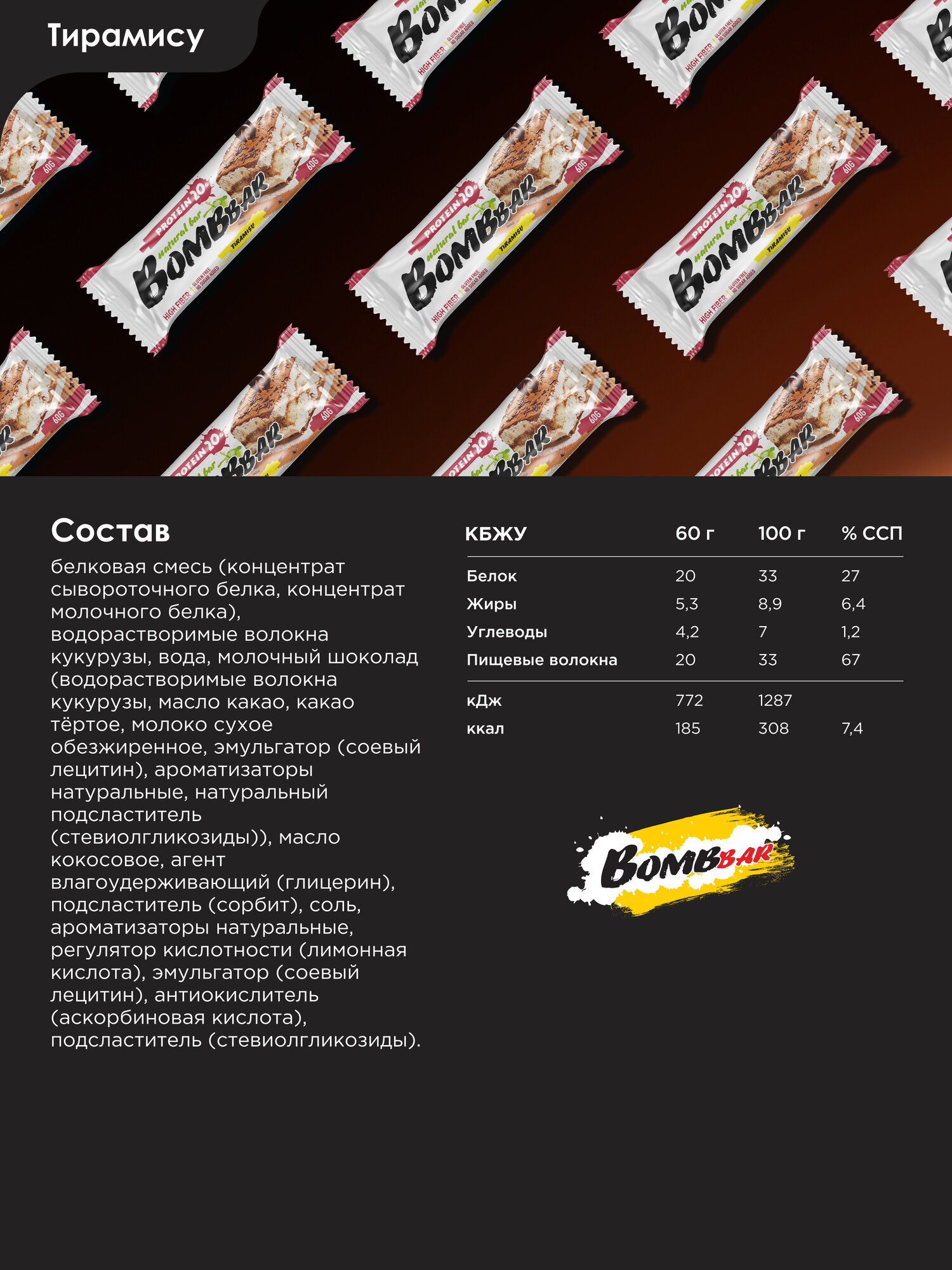 Протеиновые батончики Bombbar без сахара Тирамису, 12шт х 60г: сравнение цен, характеристики, фото, актуальное наличие и цены.