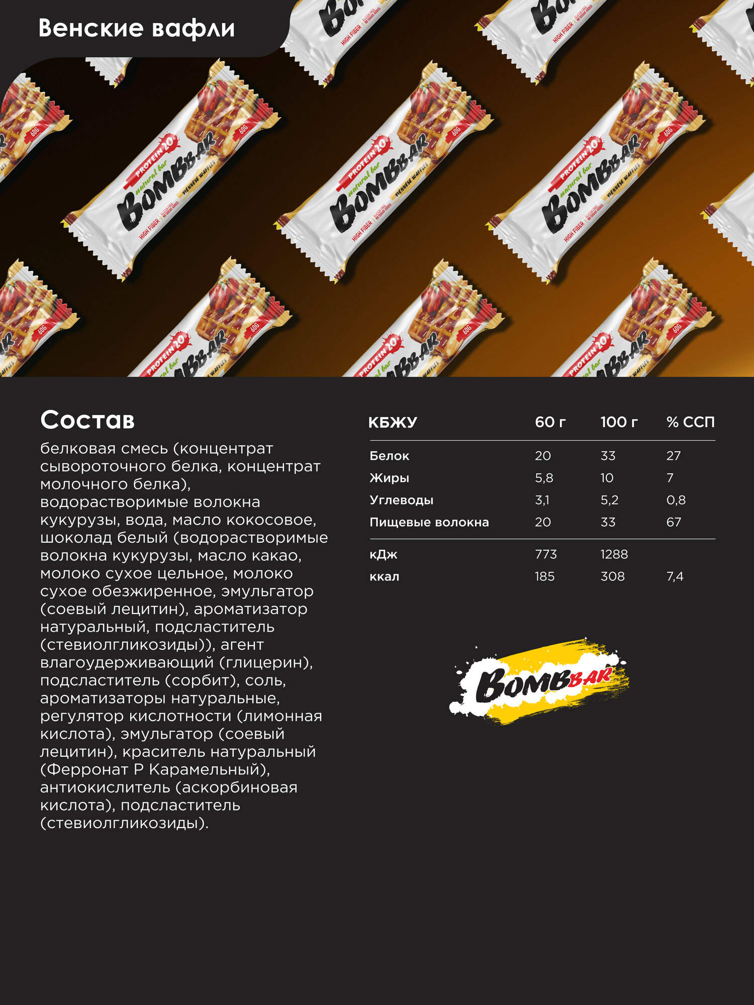 Почему именно Bombbar? Нас отличает уникальный состав из натурального высококачественного сырья и, конечно, великолепный вкус. В нашем ассортименте вы можете встретить не только высокобелковую продукцию (спортпит), но и низкокалорийную (для тех, кто следит за фигурой или сидит на диете), энергетические (для быстрого насыщения и заряда энергией), диетические (для спорта и фитнеса), а также все для здоровья. Забудь про вредное и калорийное сладкое! Наши вкусняшки делают каждый приём пищи полезным и вкусным. Вместе с нами достигать спортивных успехов становится легче!