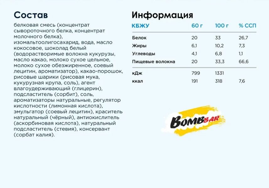BombBar батончик содержит полезные ингредиенты, такие как натуральные компоненты, богатые витаминами и минералами. Высокое содержание белка способствует восстановлению мышц и поддержанию энергии.