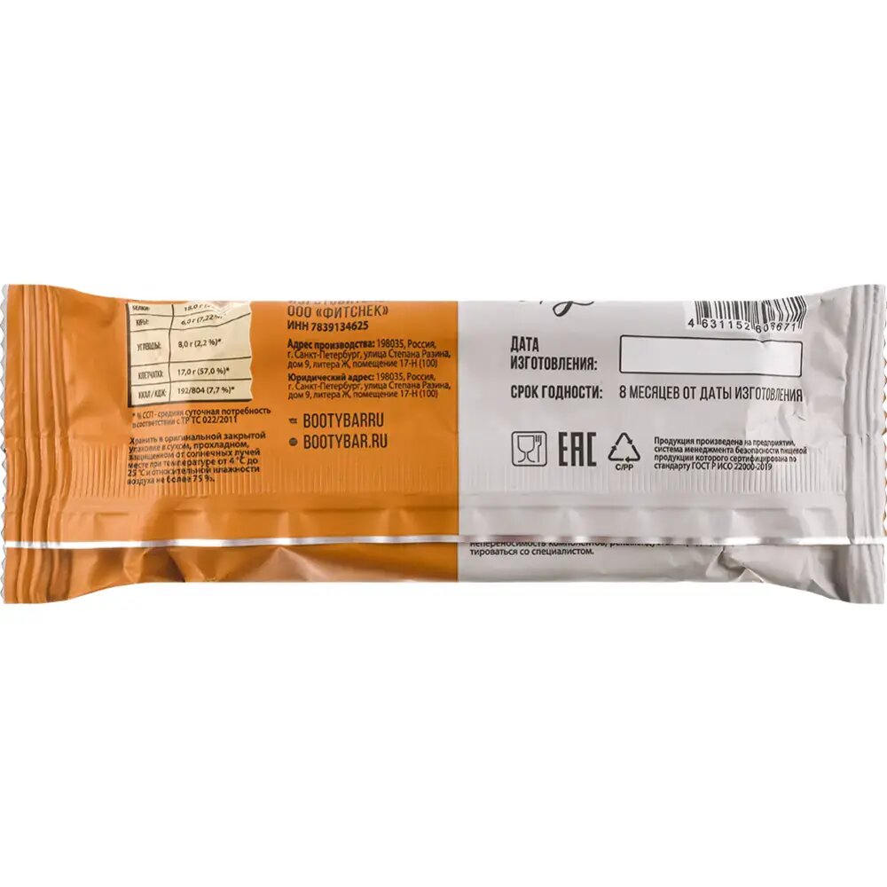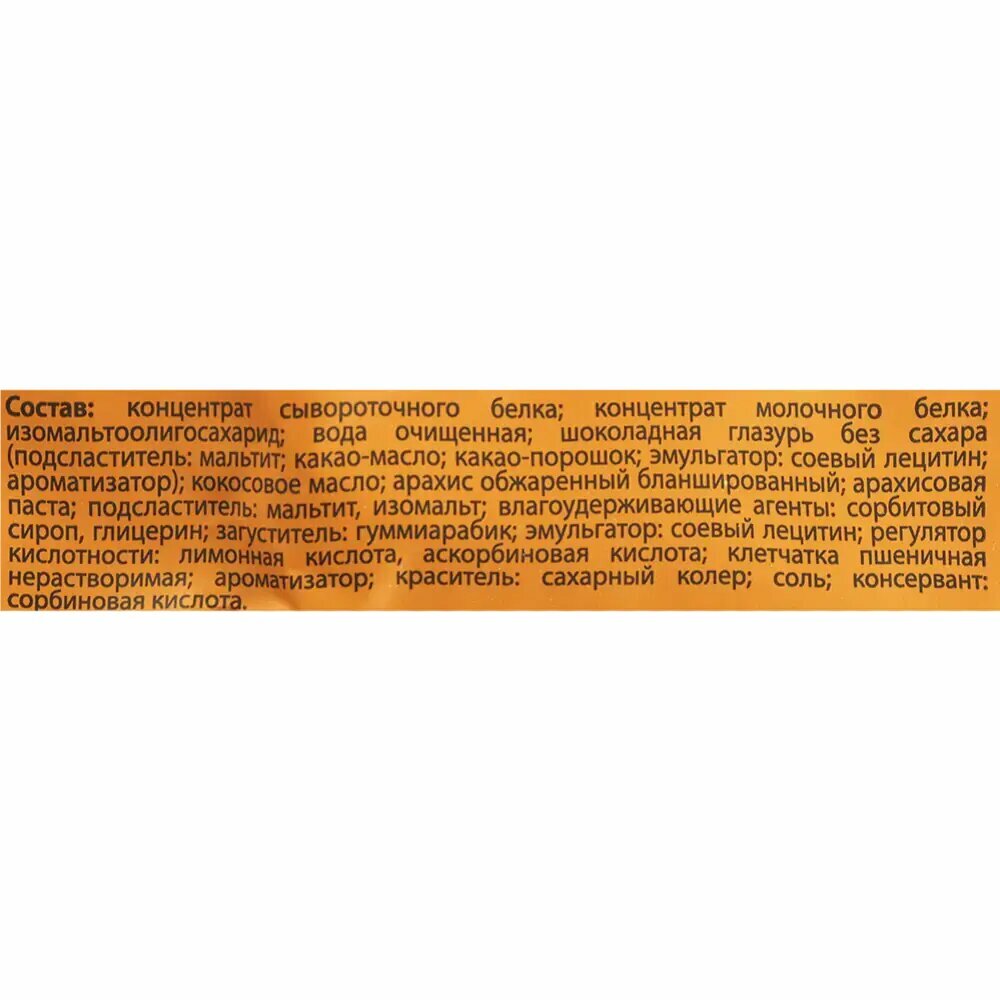 | Дополнительная информация | форма выпуска: батончик; состав: Концентрат сывороточного белка; концентрат молочного белка; растворимое кукурузное волокно (клетчатка, пребиотик); изомальтоолигосахарид; вода очищенная; протеиновая шоколадная глазурь без сахара (какао масло, подсластитель - изомальт,концентрат сывороточного белка, концентрат молочного белка, эмульгатор: лецитин соевый , подсластитель - сукралоза, ароматизатор); масла (кокосовое, какао, ши); влагоудерживающие агенты: сорбитовый сироп, мальтитол, гуммиарабик, глицерин; мука: рисовая, кукурузная; регулятор кислотности: аскорбиновая кислота, лимонная кислота; клетчатка пшеничная нерастворимая; подсластитель: изомальт; ароматизатор; красители натуральные: карамельный колер; антиоксидант: смесь токоферолов; соль поваренная; консервант: сорбиновая кислота. |