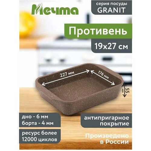Противень Гранит Brown Мечта изготовлен из высококачественного пищевого алюминия с антипригарным покрытием, что обеспечивает ему прочность и долговечность. Противень Гранит быстро и равномерно нагревается, поэтому блюда в нем хорошо пропекаются. Такая посуда незаменима для приготовления запеканок и пирогов, а также блюд из мяса и овощей. Во избежание повреждений антипригарного покрытия, не используйте металлические или острые кухонные принадлежности. После использования легко и быстро моется. Подходит для использования в духовках с максимальной температурой 250°С. Подходит для мытья в посудомоечной машине. Теперь все изделия торговой марки "Мечта" имеют оригинальный и неповторимый дизайн. Красивые и элегантные формы изделий не оставят равнодушными даже самых искушенных покупателей. Серия гранит - это литая алюминиевая посуда с антипригарным покрытием повышенной стойкости, с содержанием частиц твердых минералов. В данной серии представлен наиболее широкий ассортимент выпускаемой продукции. Покрытие "гранит" разработана на водной основе и не содержит PFOA (перфтороктановую кислоту). Все входящие в состав покрытия компоненты прошли жесткую проверку в отношении влияния на здоровье человека и окружающую среду, и поэтому оно является экологичным и абсолютно безопасным. Покрытие имеет сертификаты FDA (Управления по надзору за качеством пищевых продуктов и медикаментов США) и BFR (Федеральный институт оценки рисков в Германии). Наличие сертификата LGA* и наград Немецкого института сравнительных испытаний доказывают высокое качество и безопасность. Преимущества: сверхпрочное антипригарное покрытие отличается особой износостойкостью и превосходными антипригарными свойствами, рассчитано на интенсивное использование в течении длительного срока; ресурс более 12 000 циклов; подходит для всех типов плит, кроме индукционных. Готовка приятнее с посудой мечта.