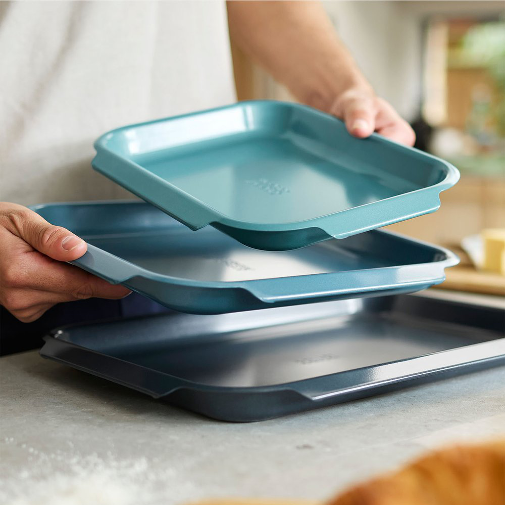 - При хранении с другими противнями для духовки Nest продуманная конструкция штабелирования позволяет аккуратно складывать их друг в друга и экономить место в ящике.