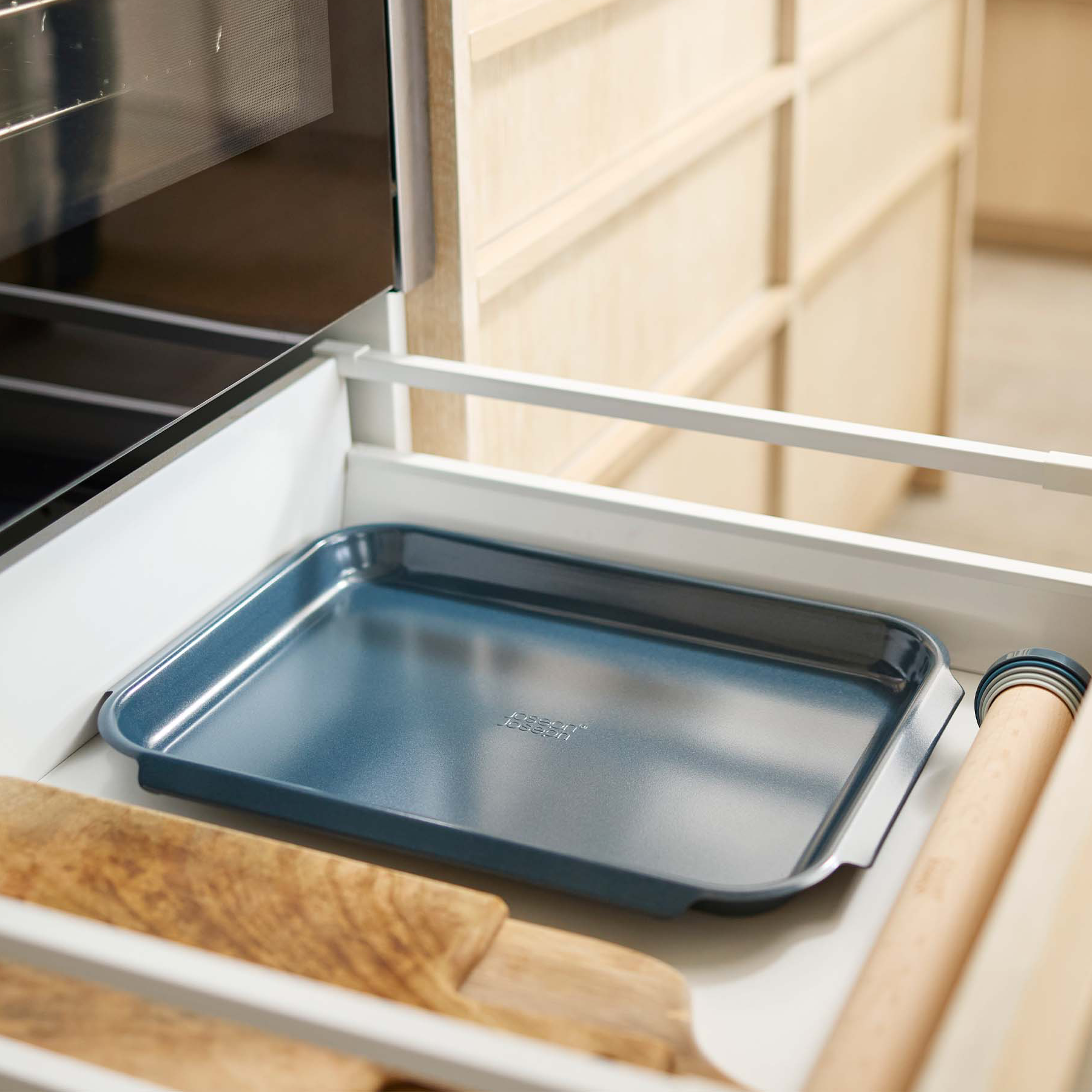- При хранении с другими противнями для духовки Nest продуманная конструкция штабелирования позволяет аккуратно складывать их друг в друга и экономить место в ящике.