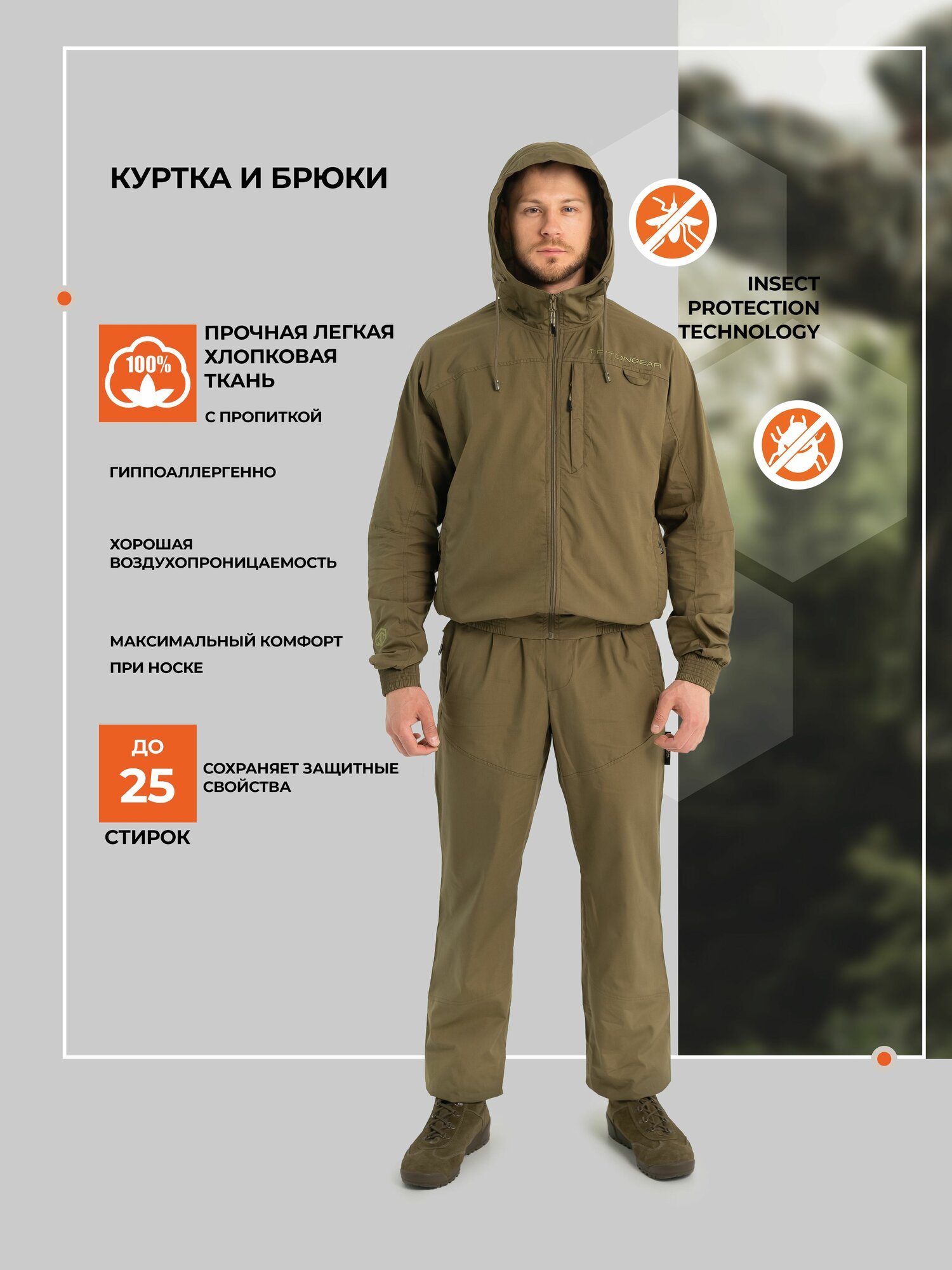 Костюм обладает надежной защитой от назойливых насекомых благодаря пропитке Insect Protection Technology.