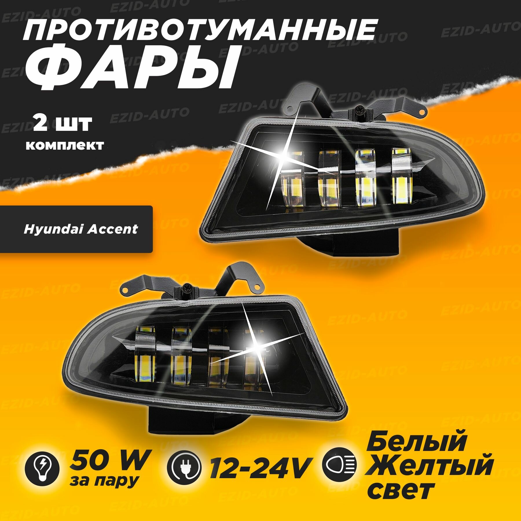 Противотуманные светодиодные фары, комплект 2 шт. Габариты фар идеально подходят для родных пазов противотуманки, крепления обеспечивают лёгкую установку, не нужно ехать в сервис. Штатное подключение птф за несколько минут. Пыле-влагозащита - IP67, полностью водонепроницаемы. Материал - литой алюминий. LED элементов в одной фаре - 4. Чёткая свето-теневая граница туманки засчёт линзованных диодов. Мощность - 50W на пару. Напряжение - 9-36 V. Цветовая температура - 5500К, холодный белый свет. Срок работы - 30000 часов. Два режима работы - белый желтый. светодиодные фары автомобильные противотуманные led лампы дхо, диодная фара для Hyundai Accent Tagaz