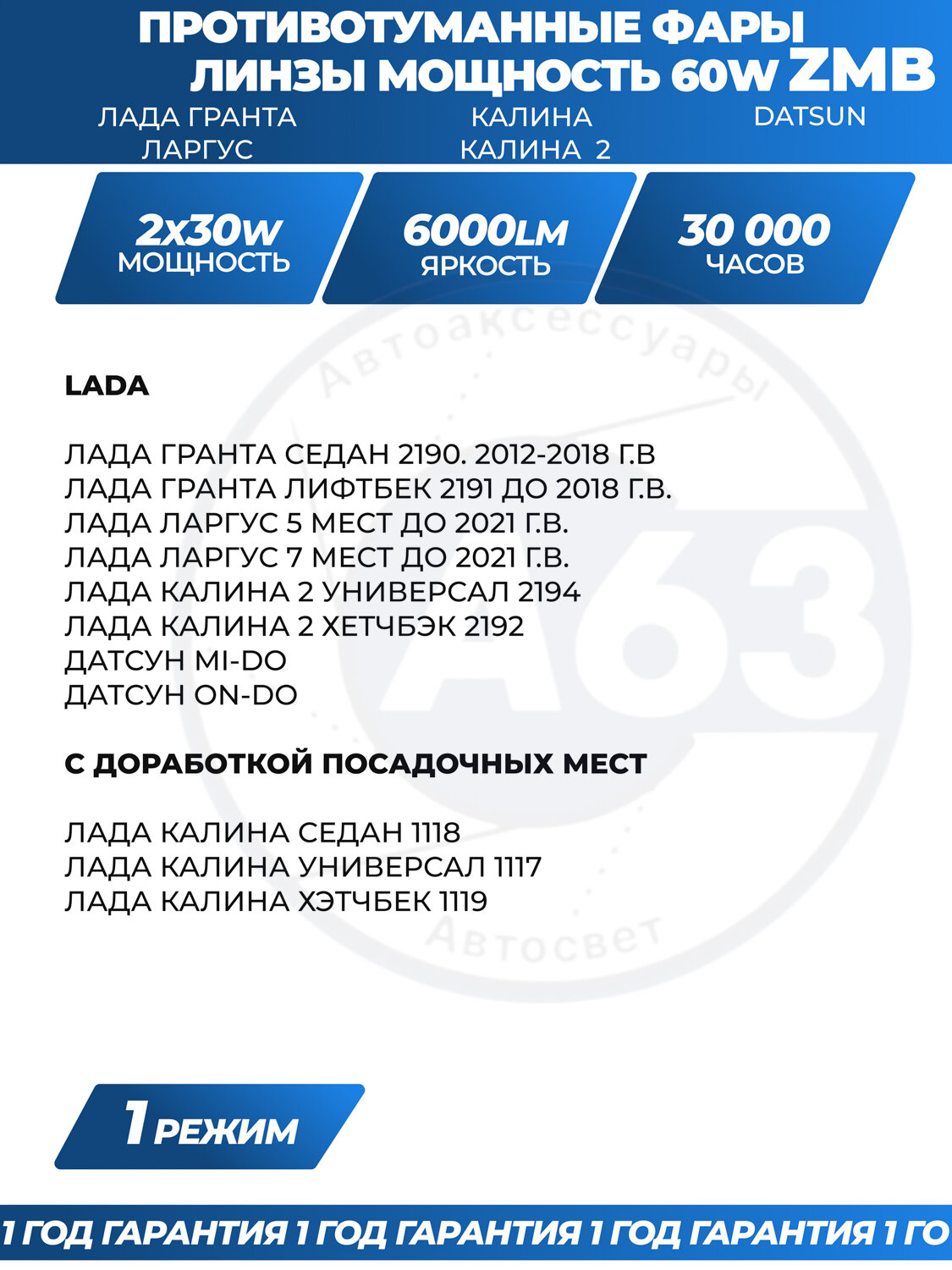Противотуманные фары Гранта (противотуманные линзы модуль) ZMB ПТФ Гранта 60W (лазерные птф Гранта), специально разработанные для автомобилей Лада Гранта. Эти противотуманки Гранта также устанавливаются на модели Лада Ларгус, Калина 2, Датсун он-до, Датсун ми-до. С доработками посадочных мест ПТФ Гранта ZMB могут быть установлены на модели Лада Калина седан 1118, Калина универсал 1117, Калина хэтчбек 1119.