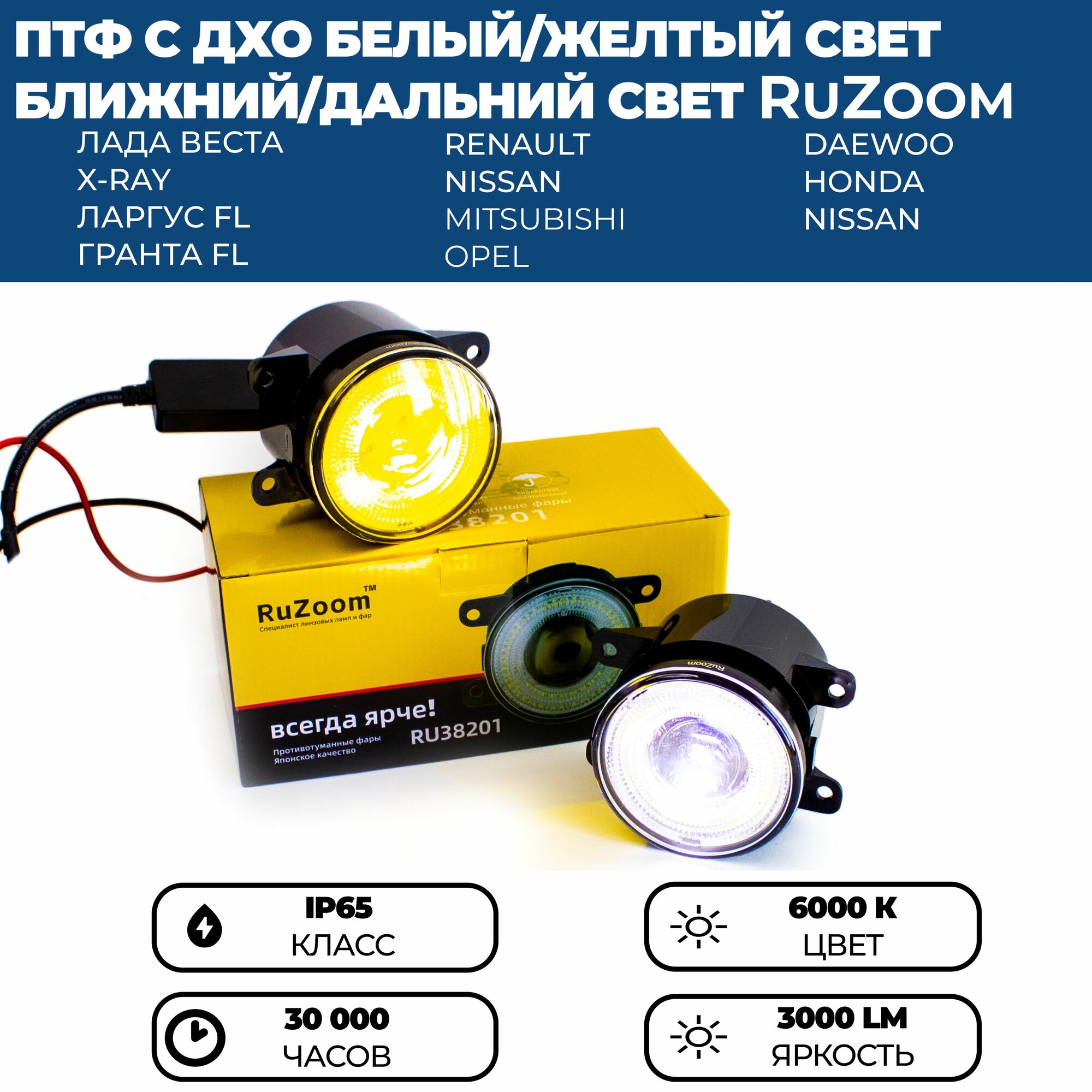 Цена указана за комплект Противотуманные фары Веста двухрежимные белый/желтый ближний/ дальний свет с ДХО RuZoom с ходовыми огнями в стиле круглые ангельские глазки комплект 2 шт.