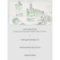 LHA-кислота (липосалициловая кислота) — мягкая форма салициловой кислоты, которая контролирует выработку себума, деликатно отшелушивает ороговевший слой и минимизирует риск воспалений.