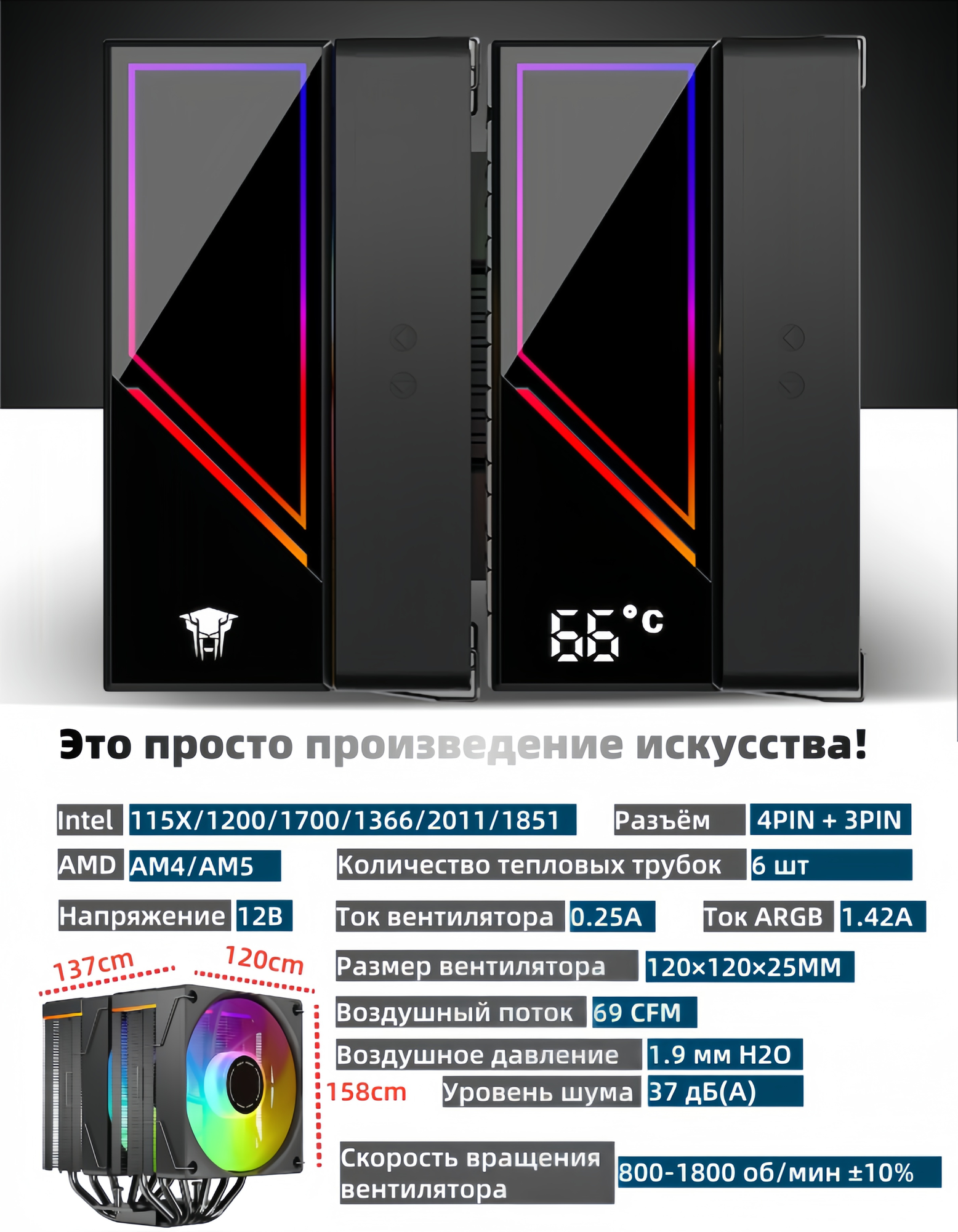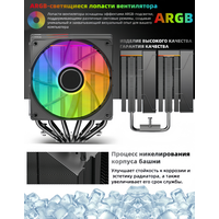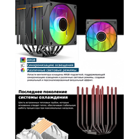 Теперь немного о самом кулере. KF620-DGT — это мощная двухбашенная система охлаждения с двумя вентиляторами. Вентиляторы работают на скорости от 800 до 1800 оборотов в минуту и создают воздушный поток до 69 CFM. Устройство способно эффективно отводить до 265 Вт тепла. При этом максимальный уровень шума составляет всего 37 дБ, что делает его достаточно тихим.