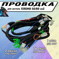 Проводка для скутера 139QMB с объёмом двигателя 50/80 см³ представляет собой жгут проводов, предназначенный для обеспечения надёжной работы электрической системы скутера. Она состоит из высококачественных материалов. В состав жгута включены 2 фишки под папу, 14 фишек под маму, а так же одна фишка под фару. Свободные провода оснащены клеммами и пинами. ВНИМАНИЕ: Данная проводка является универсальной и возможно потребует доработки конкретно под вашу модель мототехники. Для установки требуется обладание специальными навыками. Если вы не имеете таких навыков, то рекомендуем обратится к специалисту в мотосервис.